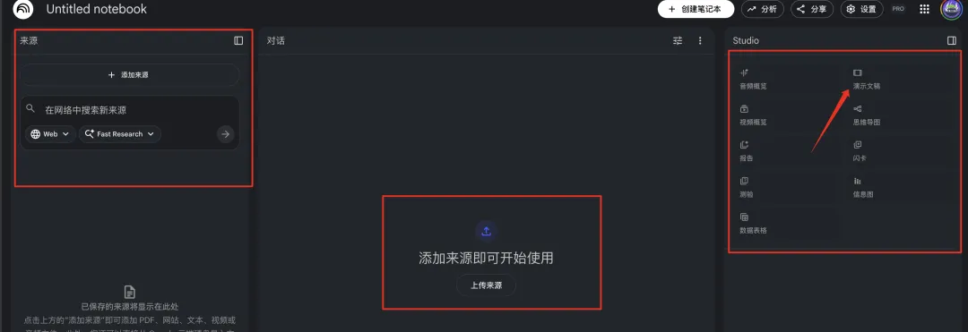 进入创建好的笔记本,左侧可以联网搜索资料,中间可以上传本地或者云盘中的资料,右侧则是选择生成的文件形式,这次我们主要测试的是演示文稿。