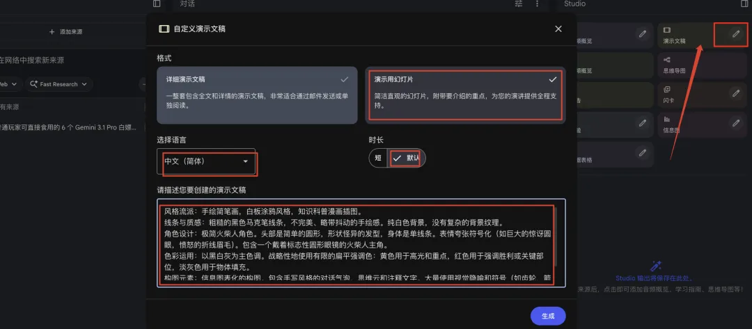 比如我使用之前的文章内容来生成 PPT,直接复制文字,或者连带图片转成 PDF 文件上传。这时候,他会先总结一下上传资料的内容。总结完毕后,我们选择右侧的演示文稿右侧的小铅笔按钮,注意:点演示文稿会直接生成 PPT,点铅笔按钮才可以进入设置界面。设置按下图所示,其中提示词我使用的是火柴人风格,在之前的文章中有详细教程:别让 Gemini 闲着!8 条 NotebookLM PPT 神级提示词,10 分钟搞定一周 PPT