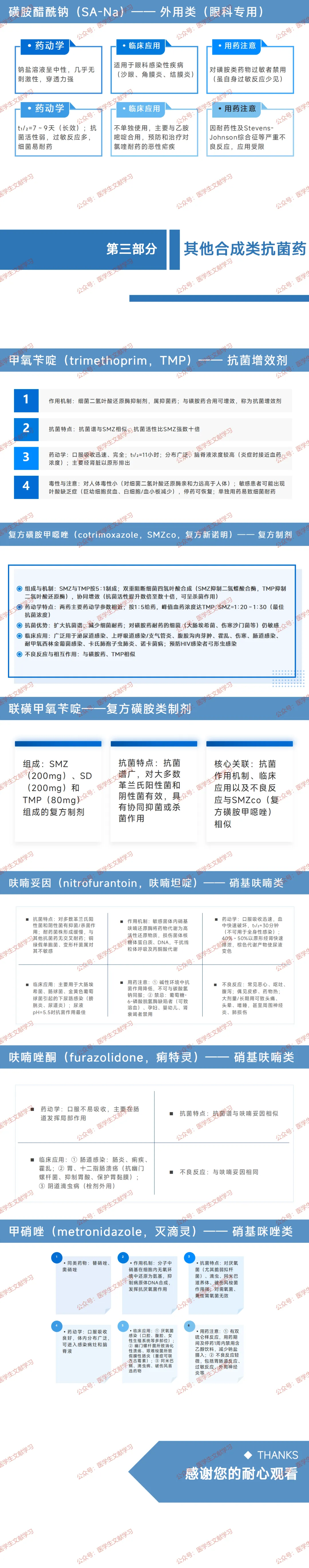 复方磺胺甲噁唑(SMZco):SMZ 与 TMP 按 5∶1 组成,双重阻断叶酸合成,协同增效,用于泌尿生殖道感染、卡氏肺孢子虫肺炎等。
