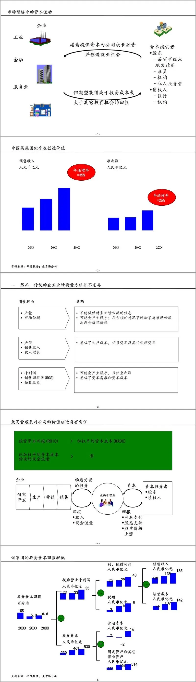 报告开篇确立了以价值创造为导向的核心战略思想。指出中国企业需从传统规模扩张转向价值创造,才能有效吸引并配置资本。传统业绩衡量指标如销售收入、净利润等存在明显缺陷,忽略了资本成本与资源效率,而投资资本回报(ROIC)、经济利润等价值指标,能更全面反映企业真实经营成效。通过数据分析发现,XX 集团虽销售收入和净利润保持增长,但投资资本回报低于加权平均资本成本(WACC),实际处于价值破坏状态,这也凸显了构建新财务管理体系的紧迫性。