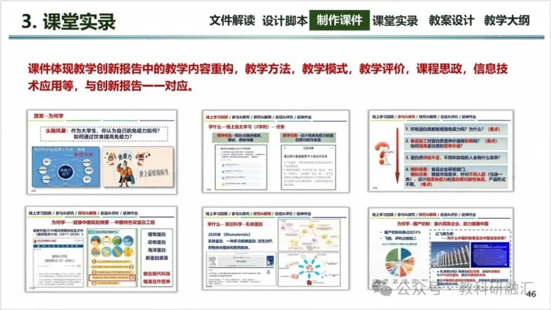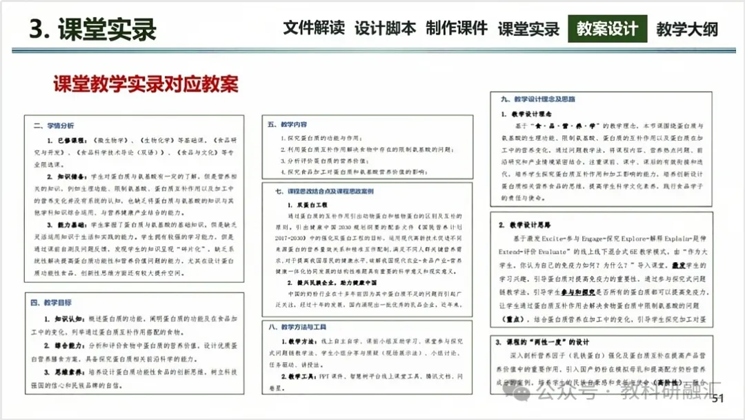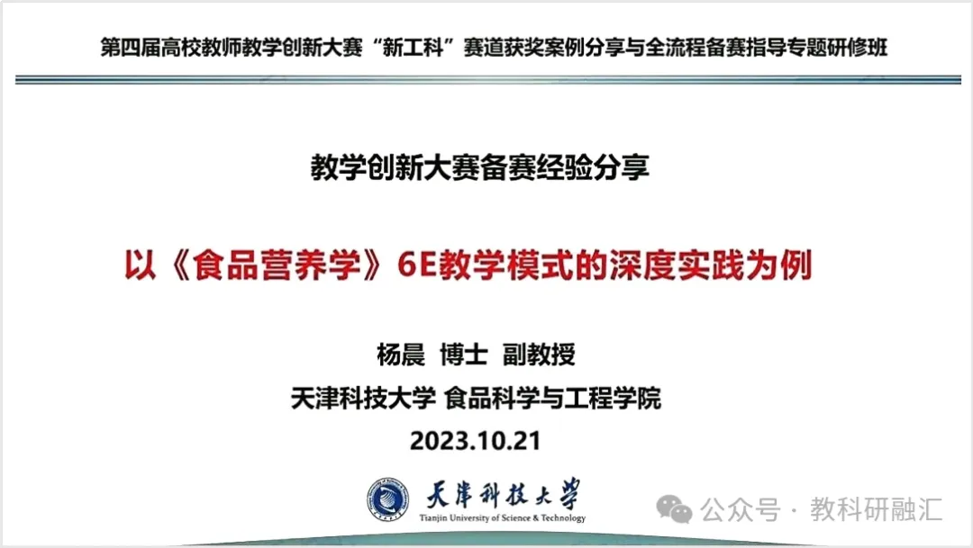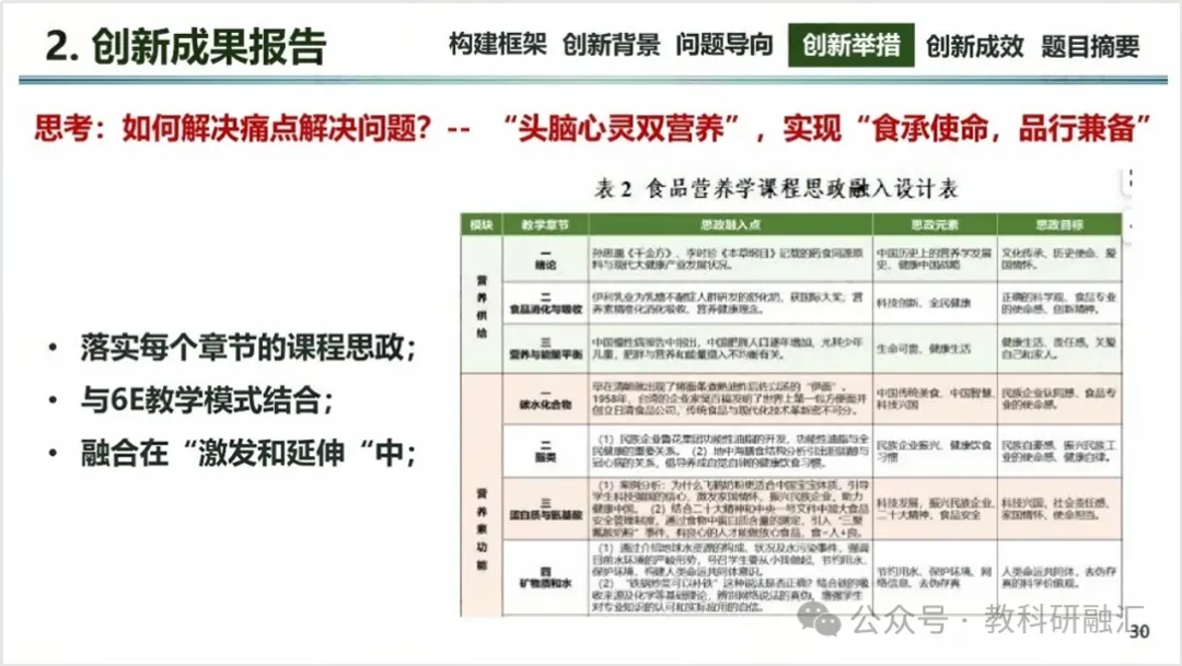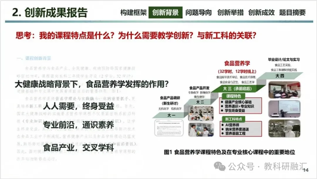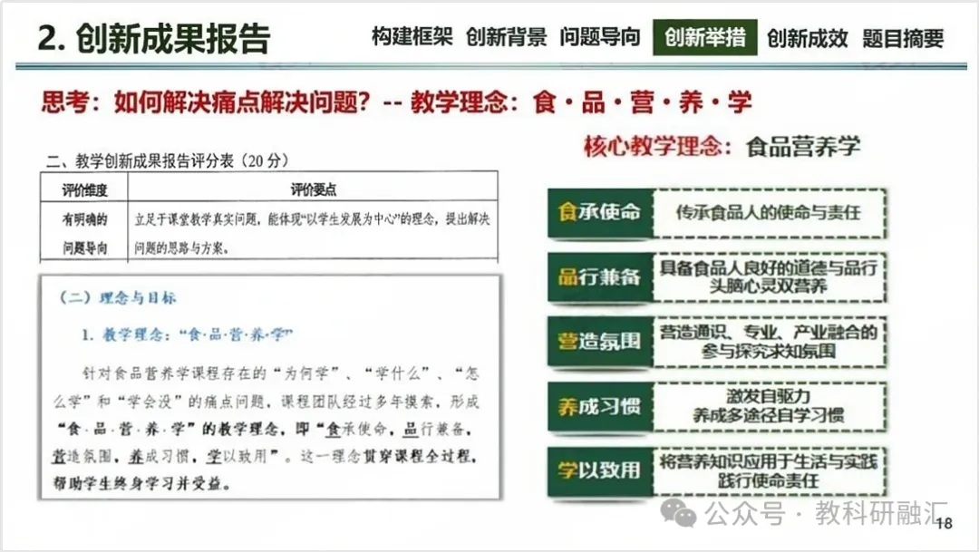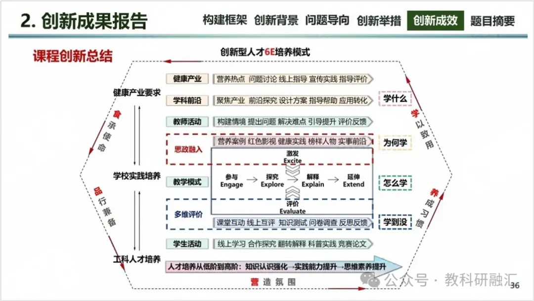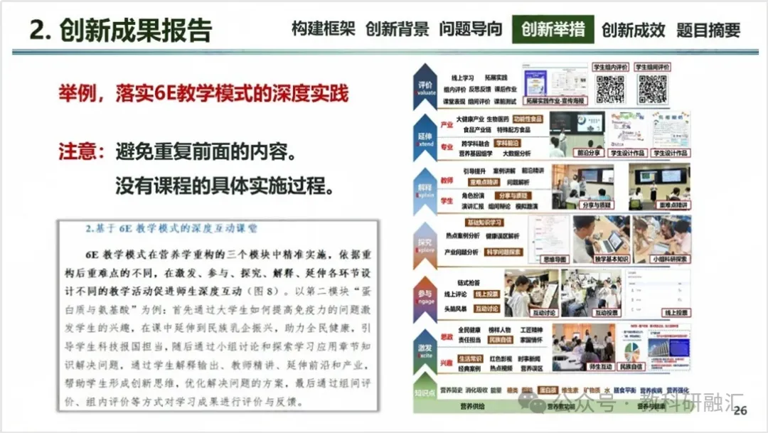以下是《教学创新大赛备赛经验分享——以《食品营养学》6E教学模式的深度实践为例”专题分享》,详细介绍了“为什么要创新”“教学中的真实问题是什么”“如何进行创新设计”“如何重构教学体系和内容”“课程思政如何融入”。