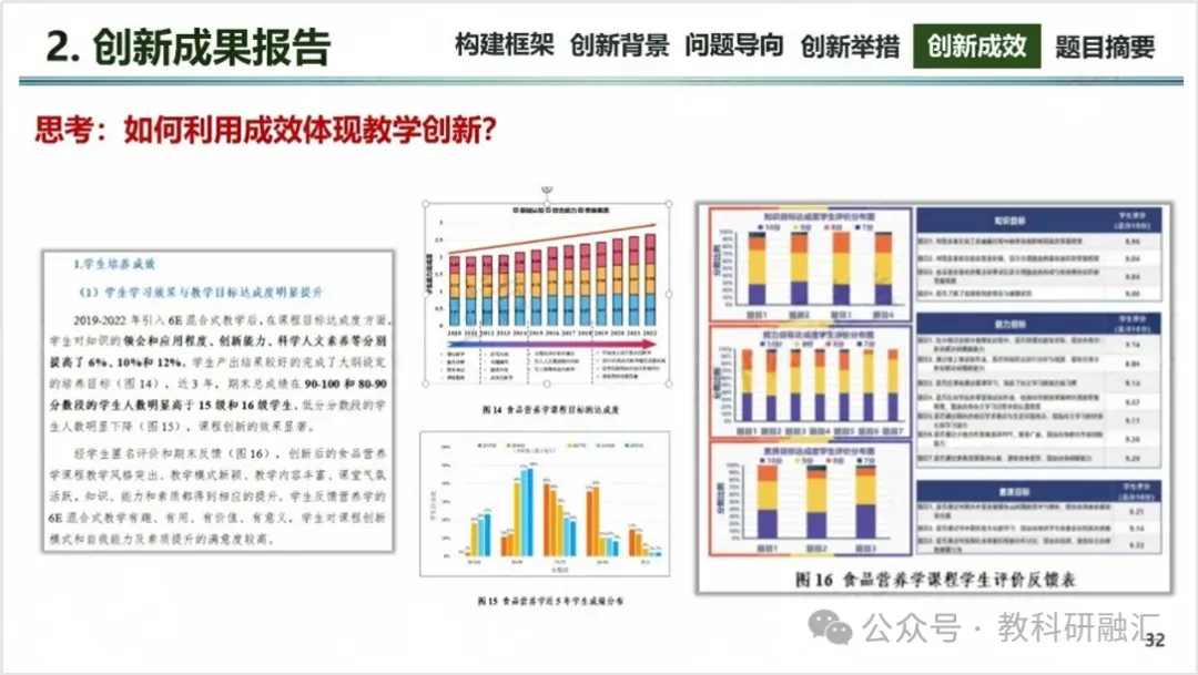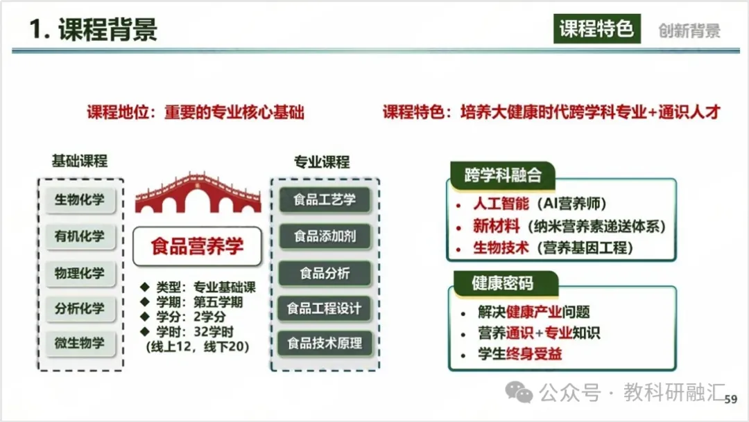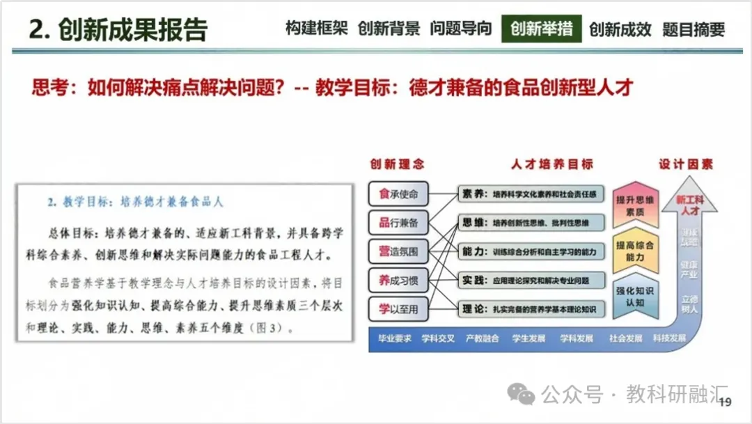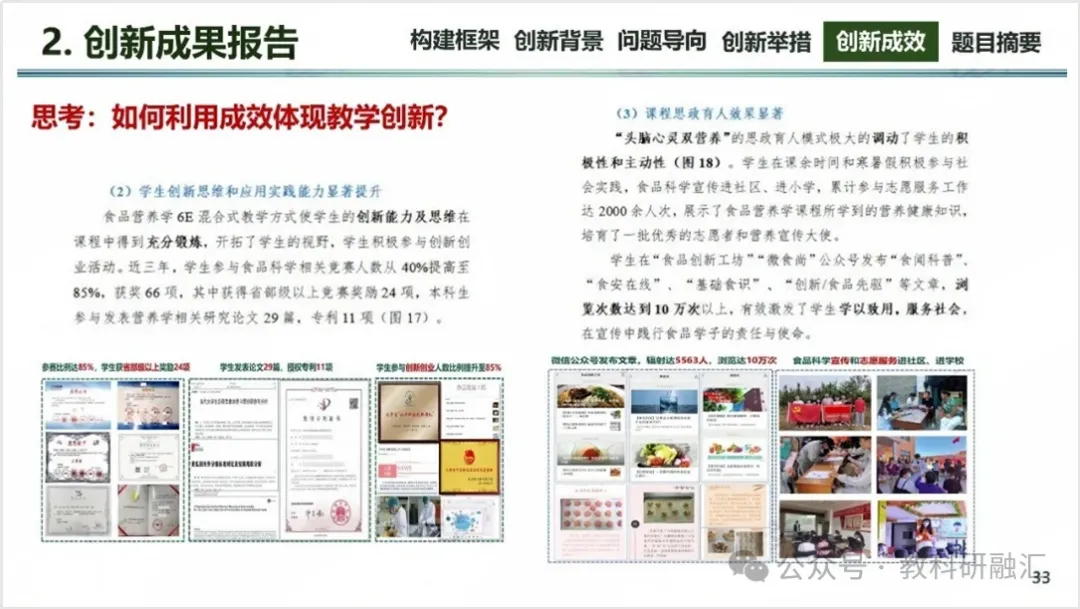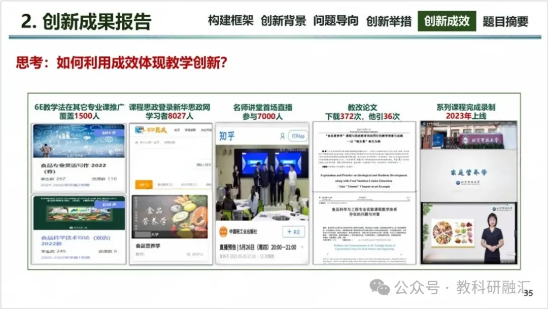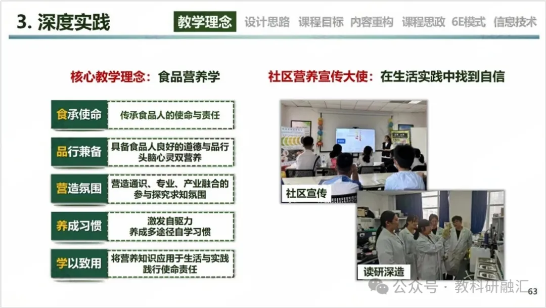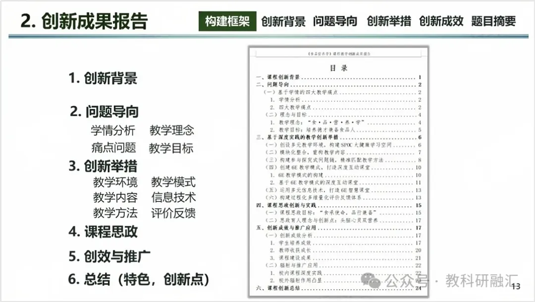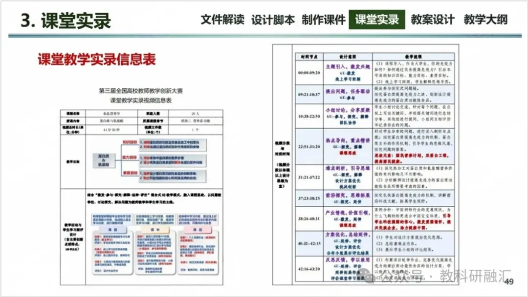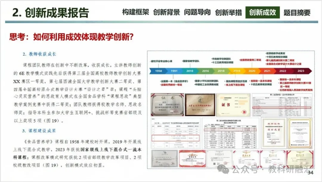 以下是《教学创新大赛备赛经验分享——以《食品营养学》6E教学模式的深度实践为例”专题分享》,详细介绍了“为什么要创新”“教学中的真实问题是什么”“如何进行创新设计”“如何重构教学体系和内容”“课程思政如何融入”。