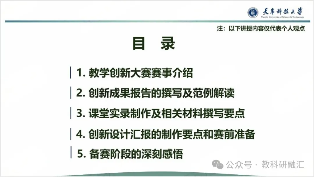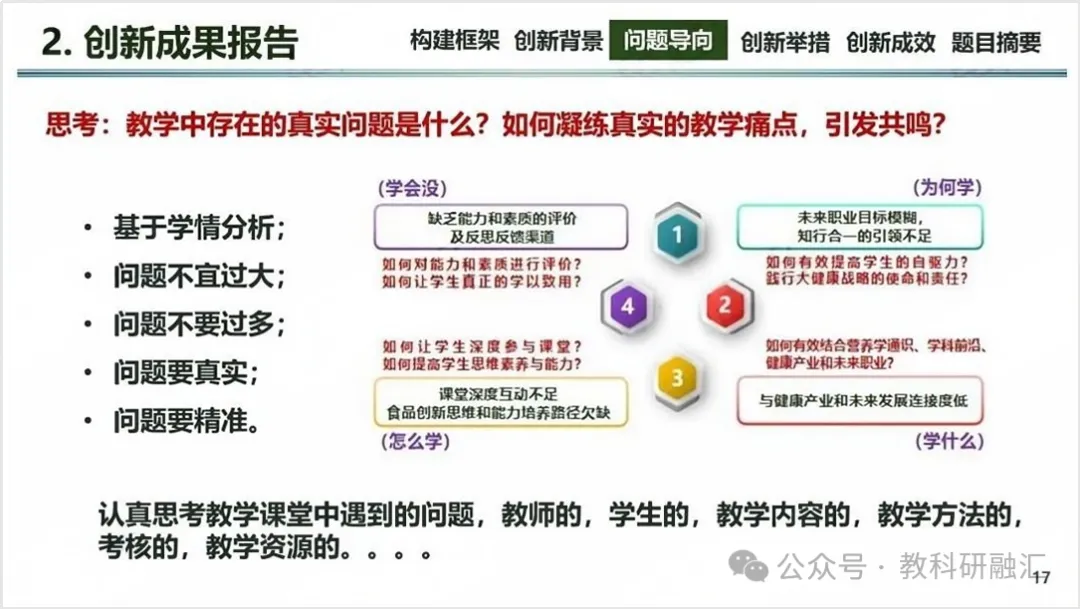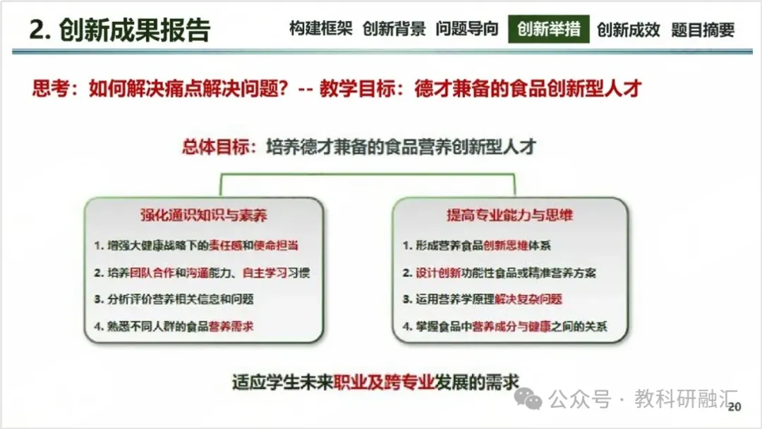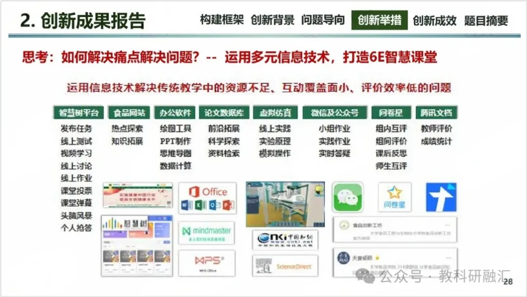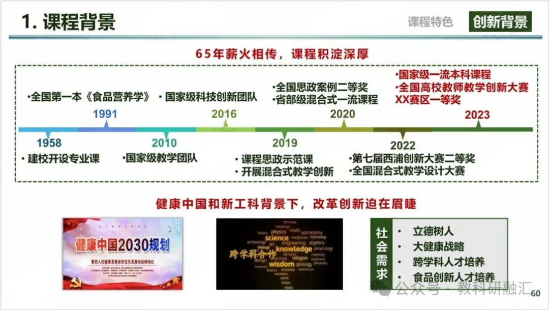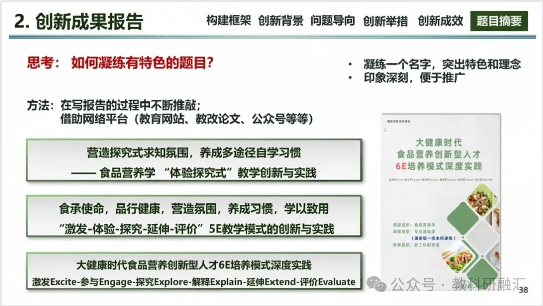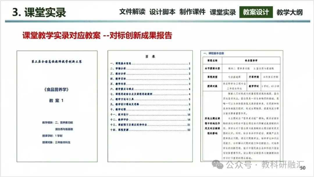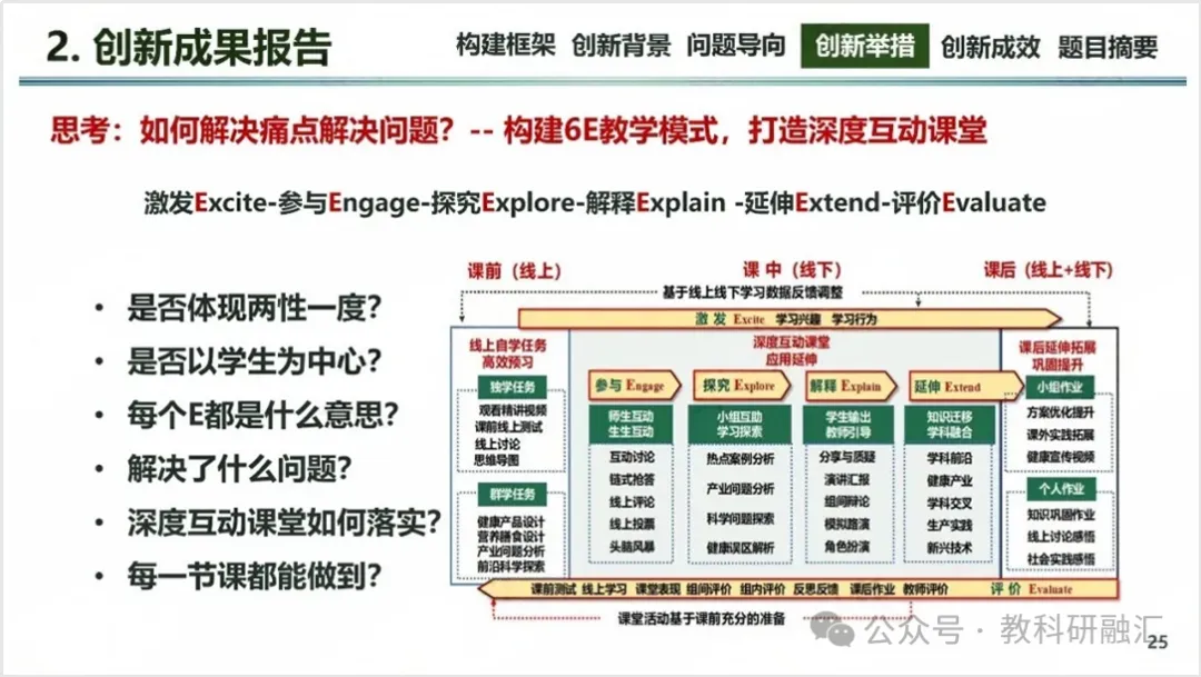 以下是《教学创新大赛备赛经验分享——以《食品营养学》6E教学模式的深度实践为例”专题分享》,详细介绍了“为什么要创新”“教学中的真实问题是什么”“如何进行创新设计”“如何重构教学体系和内容”“课程思政如何融入”。
