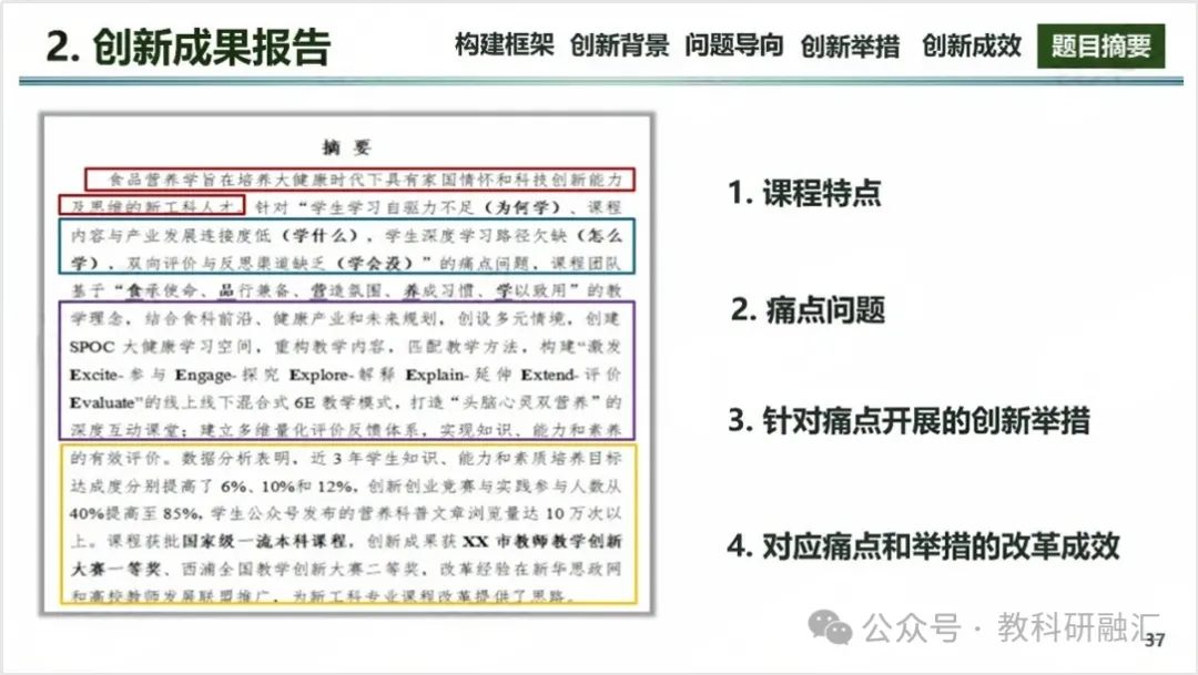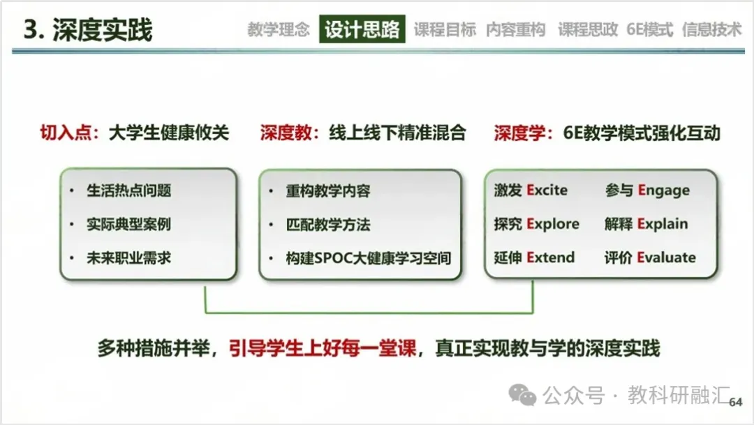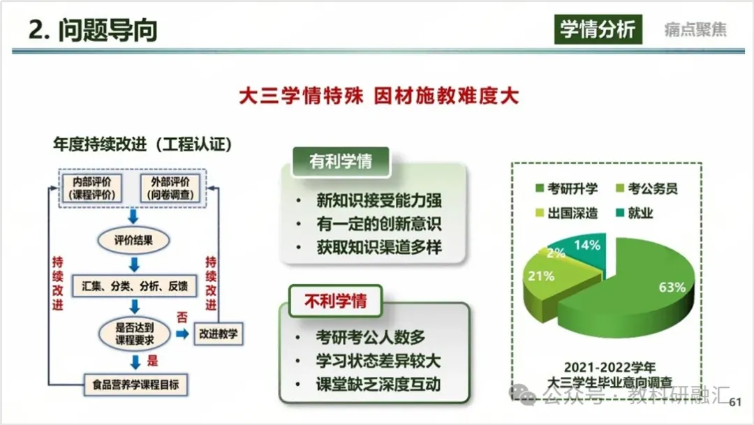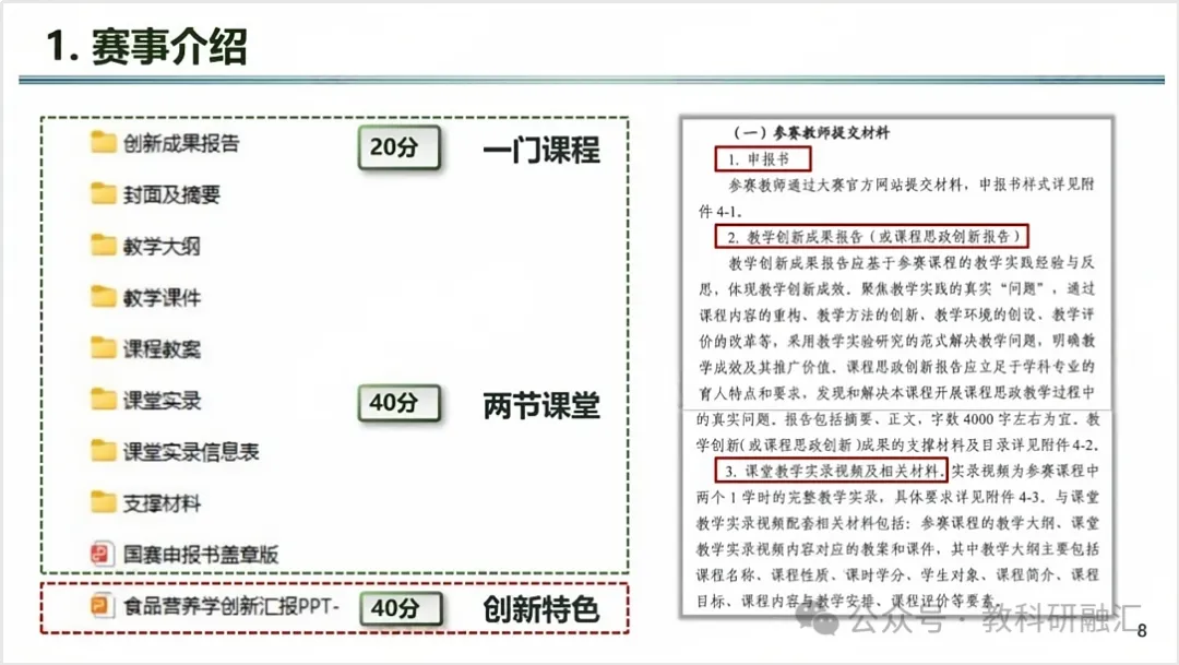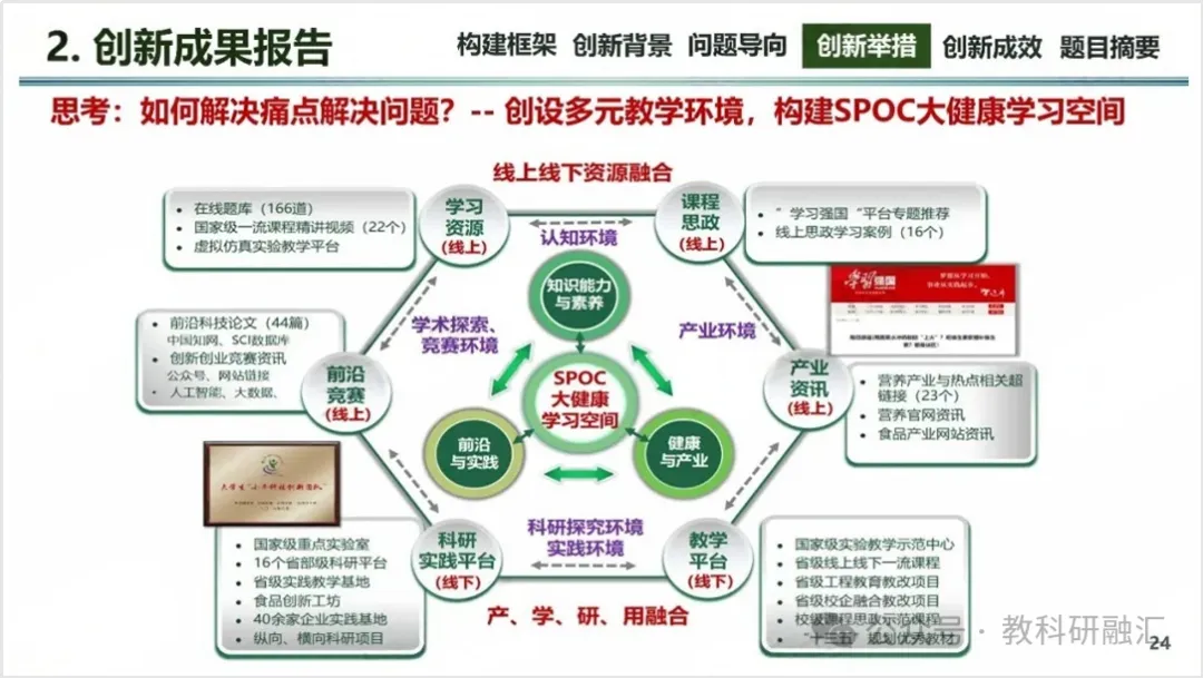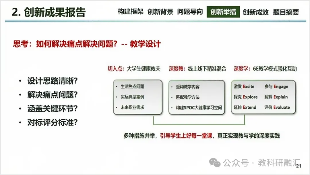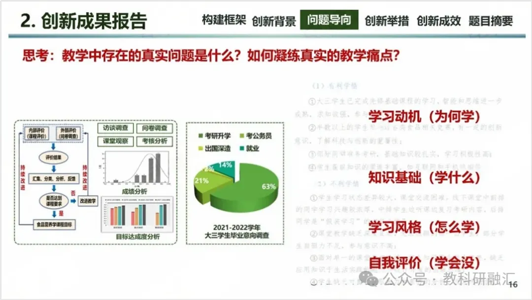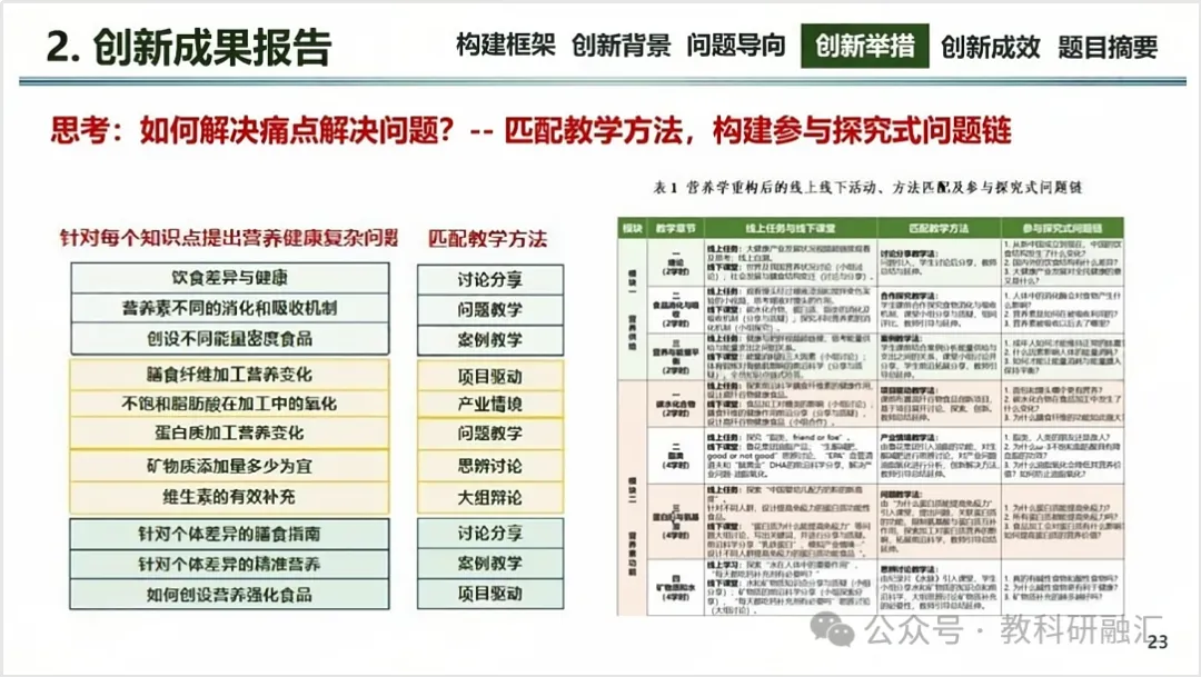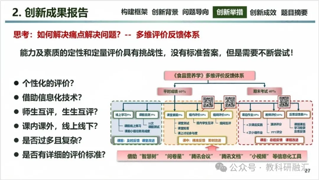 以下是《教学创新大赛备赛经验分享——以《食品营养学》6E教学模式的深度实践为例”专题分享》,详细介绍了“为什么要创新”“教学中的真实问题是什么”“如何进行创新设计”“如何重构教学体系和内容”“课程思政如何融入”。