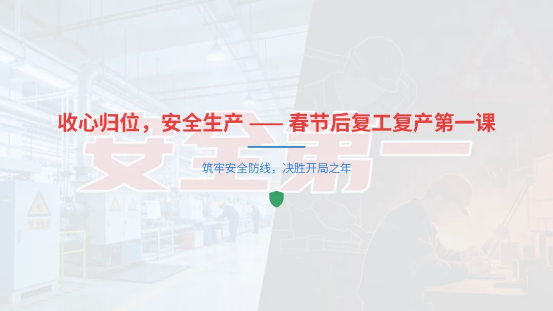 这是我们今天培训的主题:"收心归位,安全生产 —— 春节后复工复产第一课",副标题是 "筑牢安全防线,决胜开局之年"。