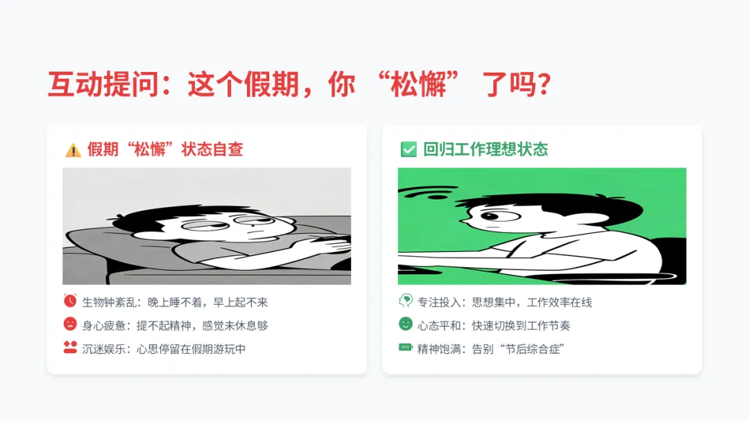 大家请看屏幕上的卡通人物对比图:左侧是假期慵懒状态的形象,右侧是应有的工作状态。