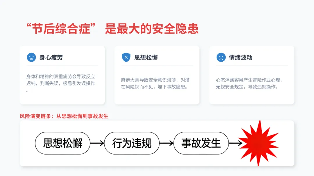 为什么说 "节后综合症" 是最大的安全隐患?因为它会直接影响我们的行为和判断。