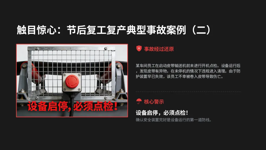 事后调查发现,皮带机的保护装置在节前就已经出现了故障,但是因为临近春节,大家都想着 "等节后再修吧",就没有及时处理。节后开工时,又没有对设备进行全面的安全检查,最终导致了悲剧的发生。