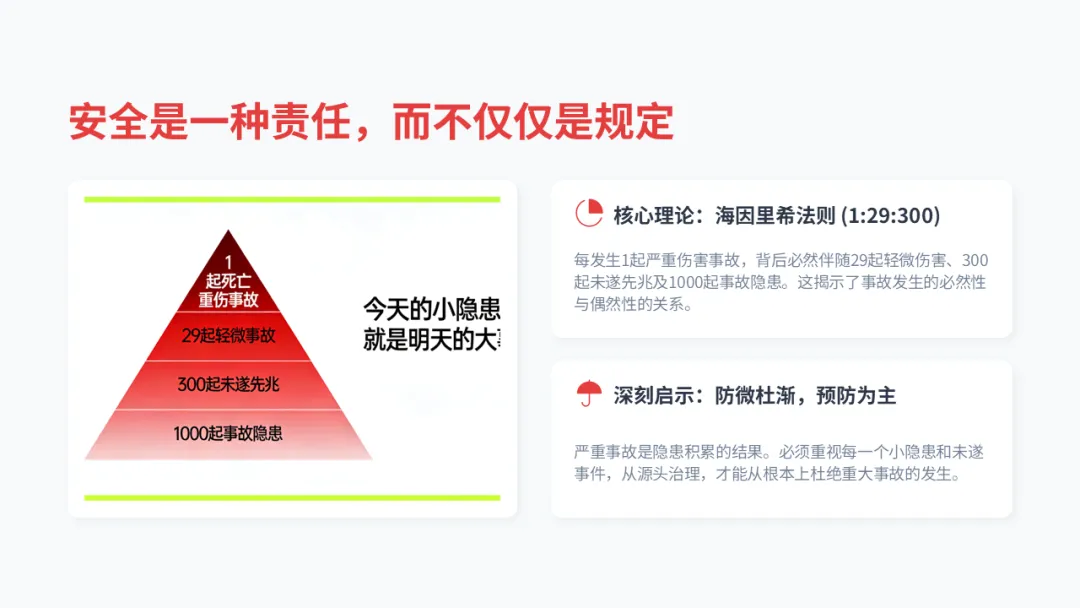 大家请看屏幕上的金字塔图形,塔尖是 1 起死亡重伤事故,塔基是 1000 个安全隐患。这告诉我们,今天的小隐患,就是明天的大事故。