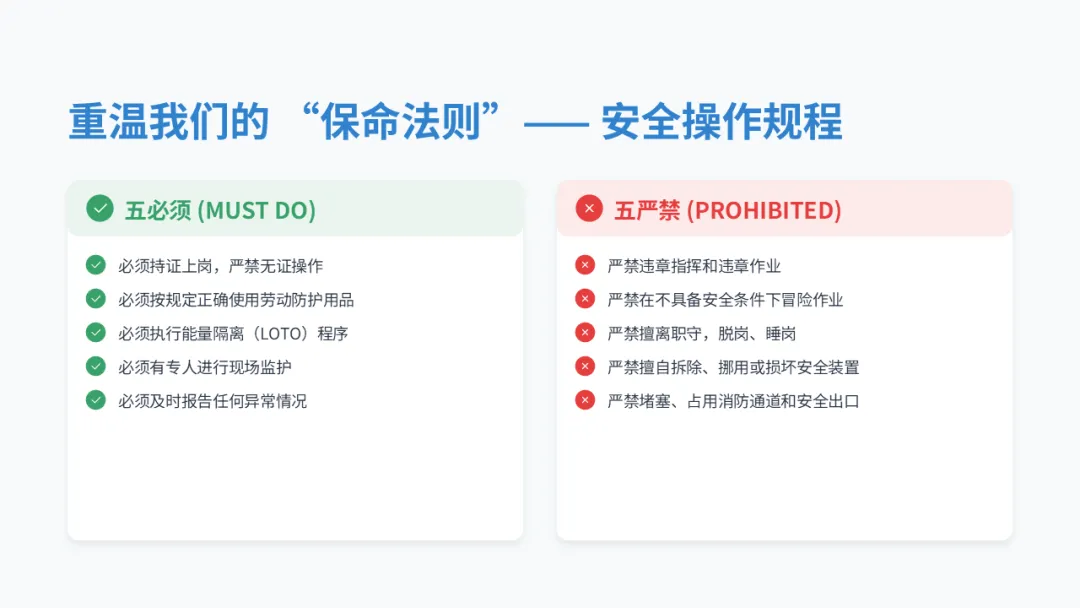 接下来,我们要重温我们的 "保命法则"—— 安全操作规程。我把它总结为 "五必须" 和 "五严禁"。