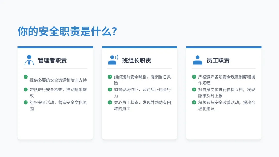 接下来,我们要明确每个人的安全职责。安全不是某一个人的事,而是我们每个人的事。