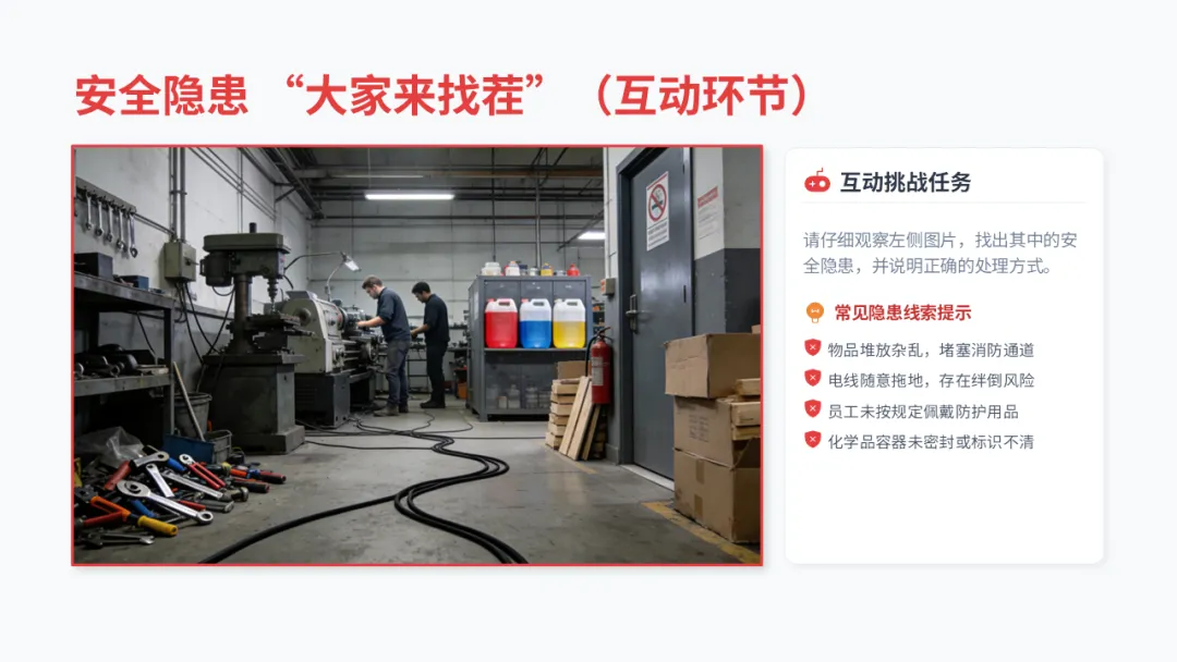 屏幕上展示的是两张对比鲜明的图片:左侧是井然有序、安全标识清晰的车间,右侧是因为员工打瞌睡、操作不规范导致事故的抽象示意图。中间是四个醒目的大字"安全第一"。