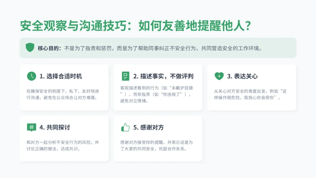 安全观察与沟通是我们每个人都应该掌握的技能。有时候,我们会发现同事的不安全行为,这时候我们应该如何友善地提醒他们?