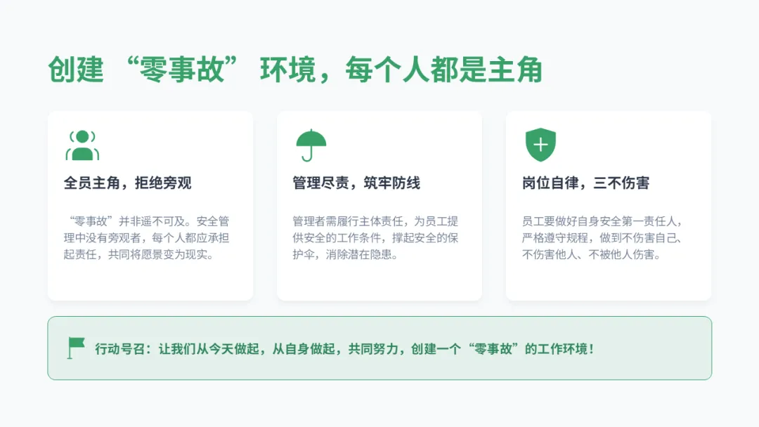 创建 "零事故" 环境是我们的目标,而实现这个目标,需要我们每个人的参与。