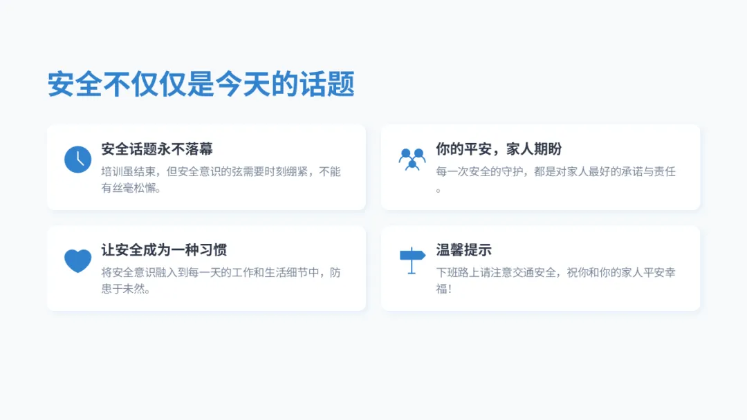 最后,我想再次提醒大家,安全是我们每个人的责任。我们要把今天学到的内容运用到实际工作中,确保我们每个人都能安全工作,平安回家。