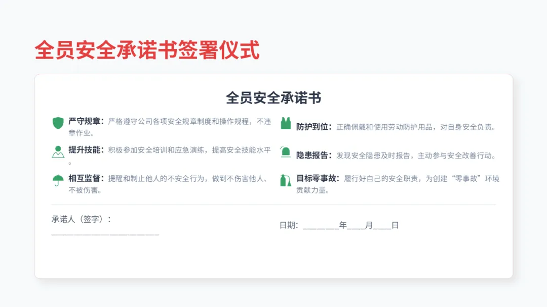 (宣誓内容)我郑重承诺:我将严格遵守安全规章制度,我将正确佩戴劳动防护用品,我将不违章作业,不违章指挥,我将及时报告安全隐患和事故,我将积极参与安全培训和安全改善活动,我将为自己的安全负责,我将为同事的安全负责,我将为公司的安全负责,我承诺,我要安全,我会安全,我能安全!