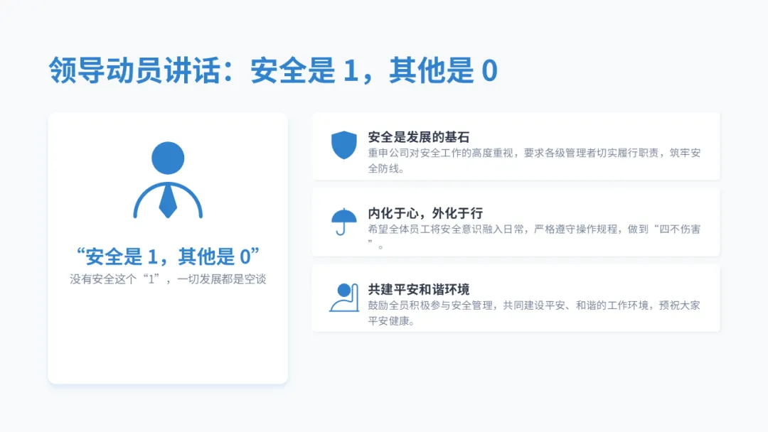感谢领导的讲话。领导的讲话非常重要,他告诉我们,安全是 1,其他是 0。没有安全这个 1,后面的 0 再多也没有意义。