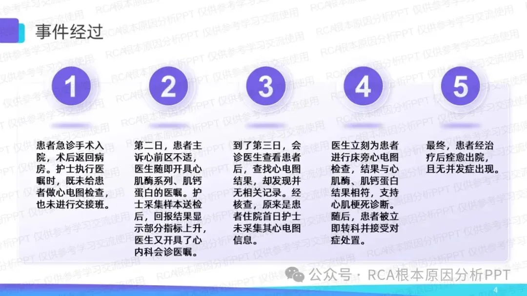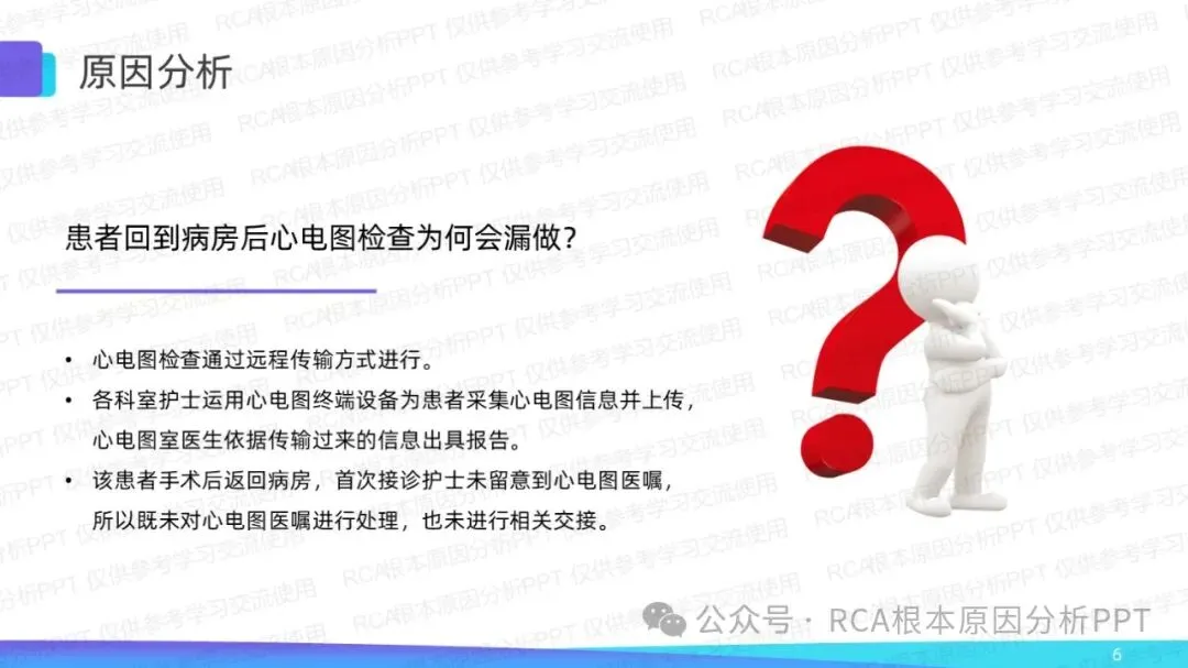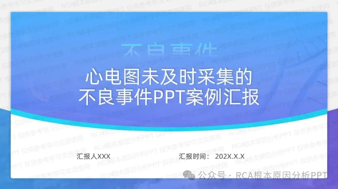 心电图检查是一项至关重要的诊断工具,它能够为医生提供关键的心脏电活动信息,对患者的病情诊断和治疗方案制定起着不可或缺的作用。然而,在实际工作中,心电图未及时采集的不良事件时有发生,这不仅可能延误患者的病情诊断,还可能给患者带来潜在的健康风险。本次 PPT 案例汇报将围绕一起心电图未及时采集的不良事件展开,深入分析事件经过、原因,并提出针对性的整改措施和总结思考,以期为临床工作提供借鉴和启示。