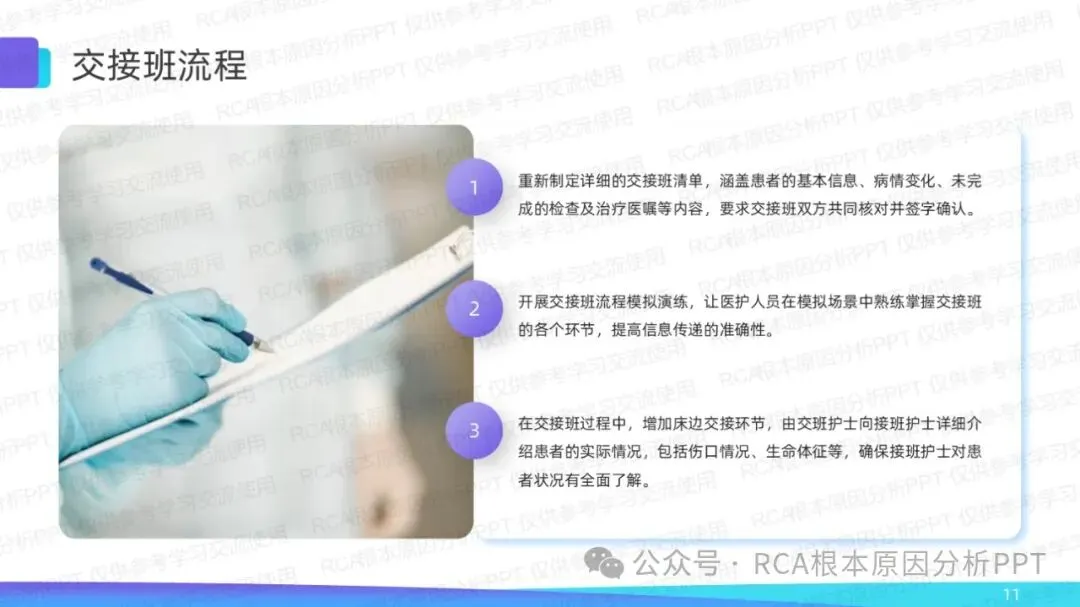 重新制定更为详细、全面的交接班清单,内容涵盖患者的基本信息、病情变化、未完成的检查及治疗医嘱等各个方面,要求交接班双方必须共同核对清单内容并签字确认,确保信息传递的准确性和完整性。