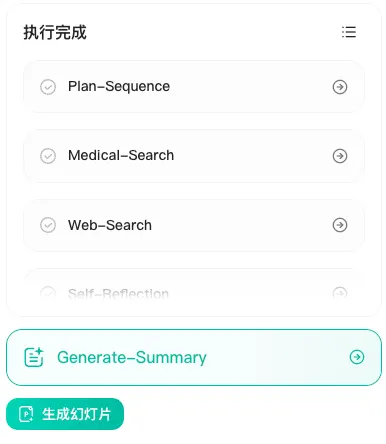 在每次任务中,通过提问框选择Agent模式并输入分析主题,待生成详细的报告后,点击界面左下方的的“生成幻灯片”,即可在2分钟左右将报告内容自动转化为结构清晰的演示文稿。