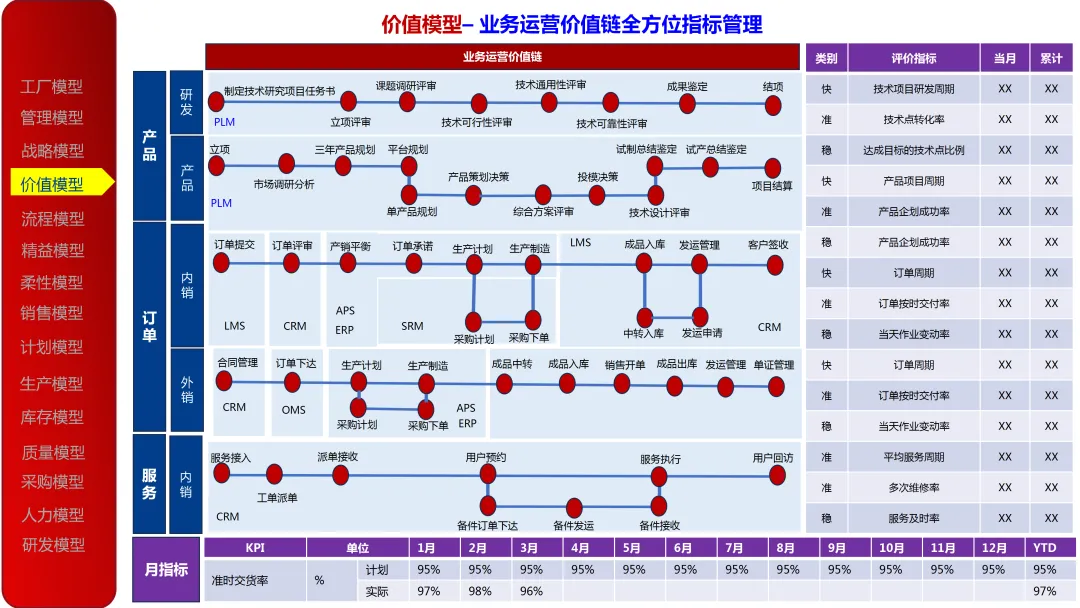 流程通畅了,就需要用“数据仪表盘”来监测健康度。我们为研发、订单履行、生产、服务等核心价值链环节,设计了一套平衡“快、准、稳”的指标体系。例如,衡量研发的“技术项目周期”和“产品企划成功率”,监控生产的“订单按时交付率”和“设备OEE”。这些实时数据让我们能精准定位瓶颈,驱动持续改善。