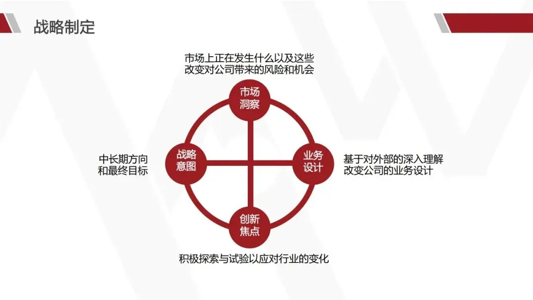 战略制定是将理念转化为具体行动方案的关键环节。华为的战略制定过程涵盖了市场洞察、业务设计和创新焦点等多个方面。市场洞察是战略制定的基础,华为通过多种工具,如PEST分析、产业价值转移分析、五力模型等,全面了解市场动态、客户需求和竞争态势。这些工具帮助华为识别外部机会与威胁,为战略制定提供数据支持。
