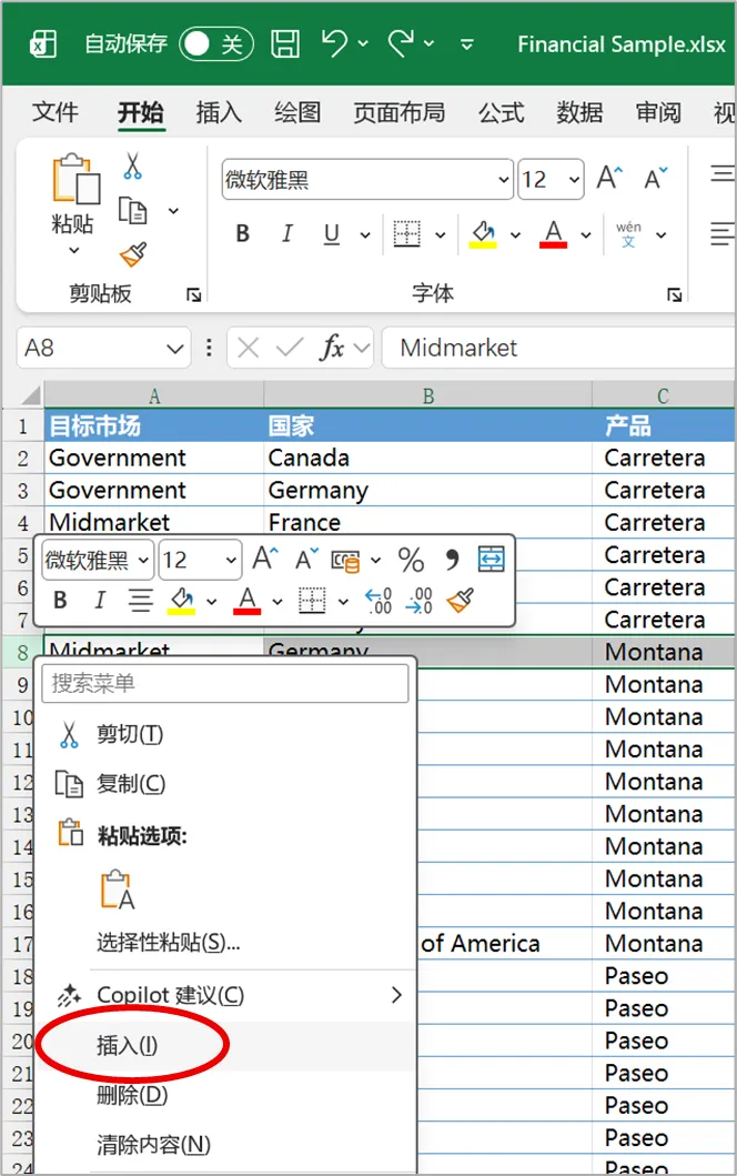 首先,在要插入多个空行的位置,右击行标,并执行【插入】命令,以插入第一个空行。