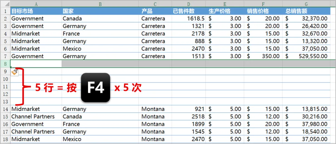 然后,反复按【F4】键,以重复上述操作,直至插入的空行数量满足你的需求为止。