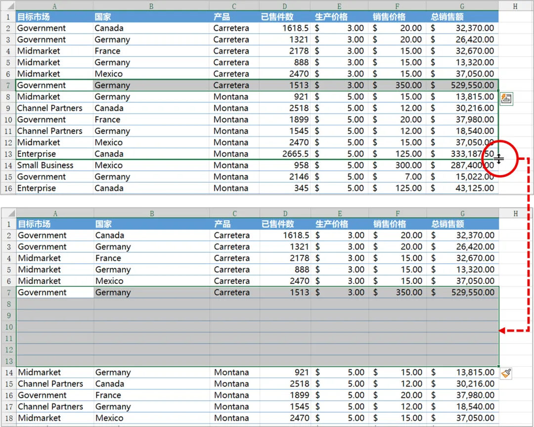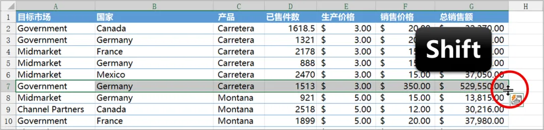 首先,在要插入多个空行的位置,选择其上方的整行数据,并将鼠标指针指向填充柄,按住【Shift】键,鼠标指针将会变为“等号加双箭头”形状。