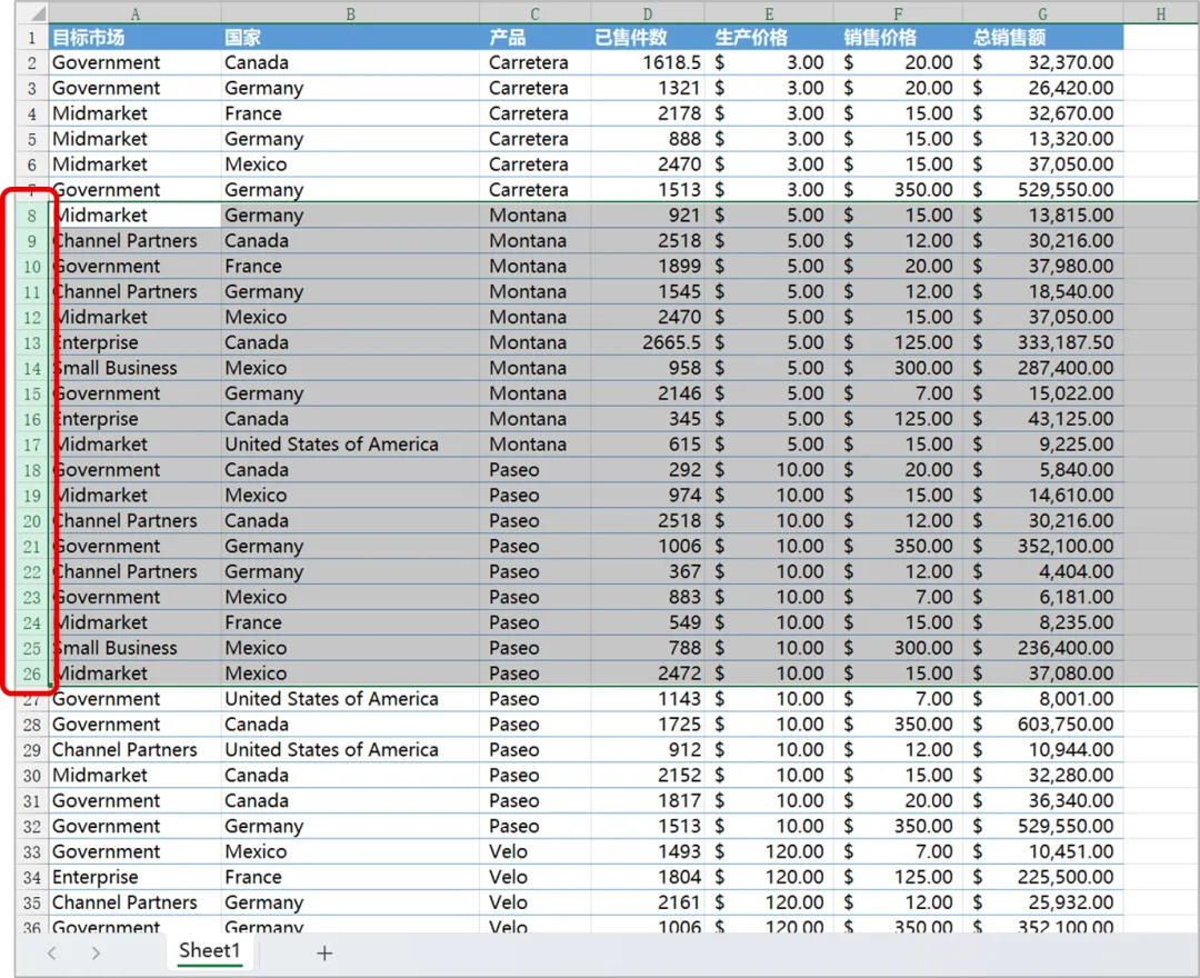 首先,在要插入多个空行的位置,选择多个现有数据行的行标,所选行数将是预期插入空行的数量。