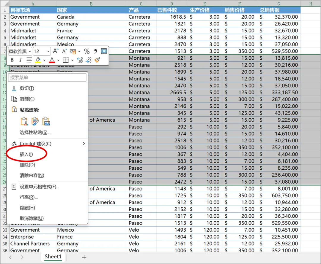 然后,右击所选行标中的任意位置,并执行【插入】命令。