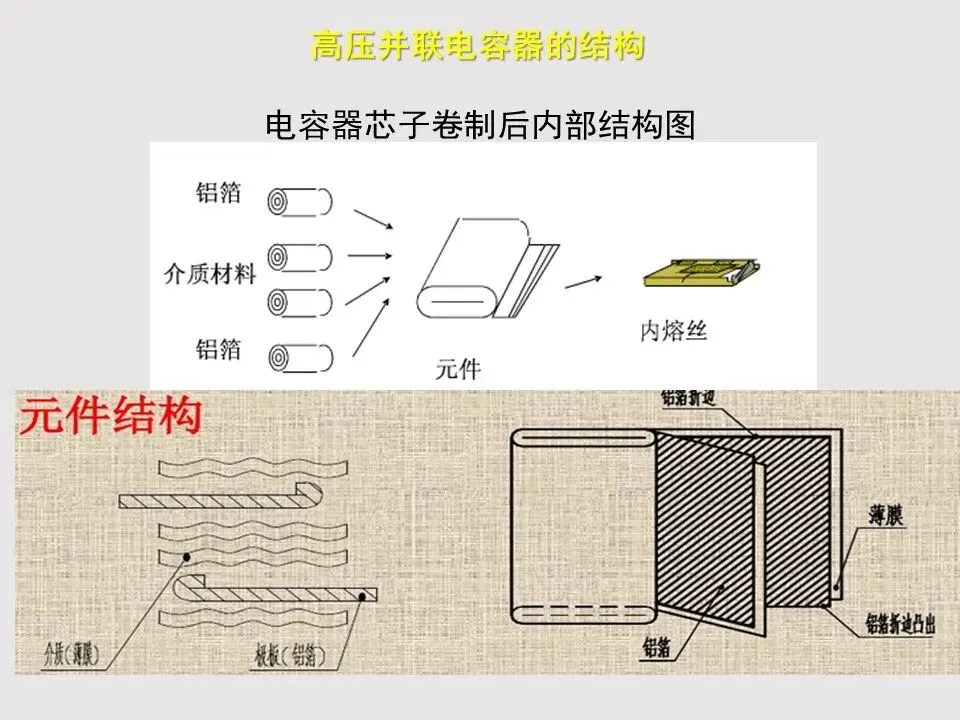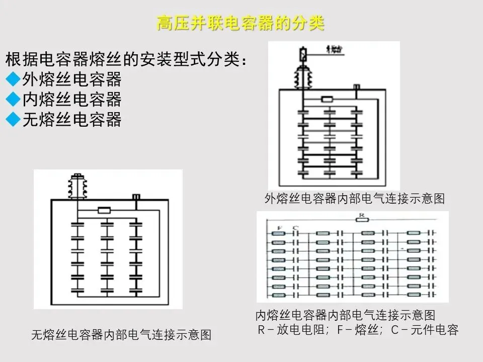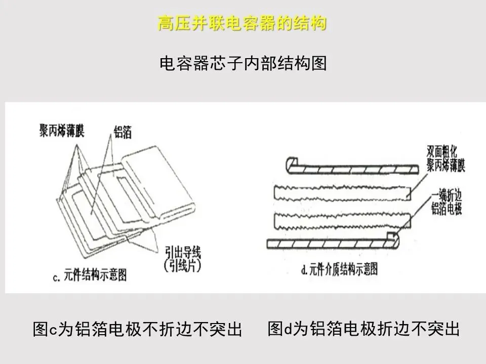所谓无熔丝电容器是指在电容器组中单元的接线方式为先串后并,在单元内部的元件连接方式上则与外熔丝电容器的单元完全相同,都是先并后串。
