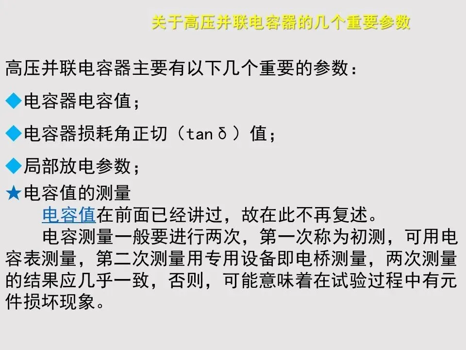 试验时要施加电容器额定电压2.15倍的试验电压,有一个元件击穿即为不合格。可根据试品电容量的大小,接入适当感抗值的电抗器。