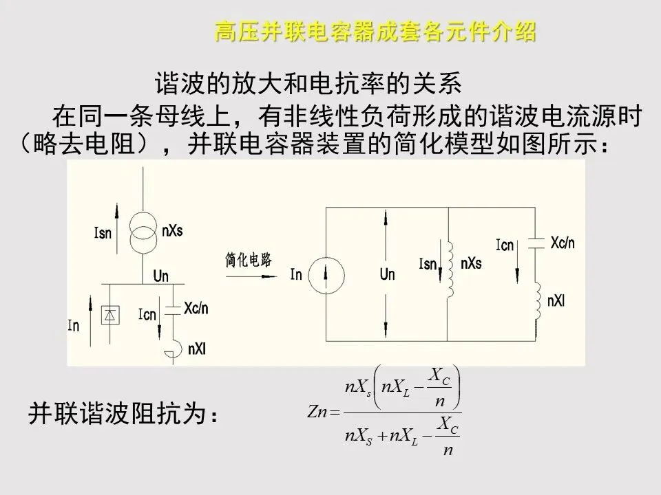 电网的正常运行。在供电系统中作为无功补偿用的并联电容器,对于某次谐波若与呈感性的系统电抗发生并联谐振,则可能出现过电压而造成危害。过大的谐波电流可能使电容器寿命缩短、鼓肚、熔丝群爆甚至损坏、烧毁、爆炸等。