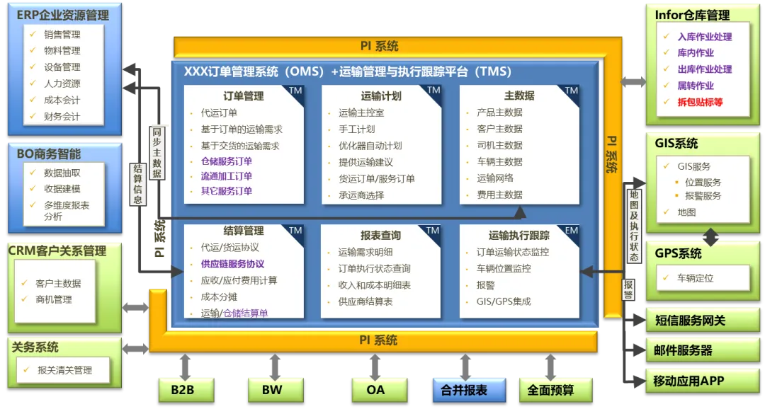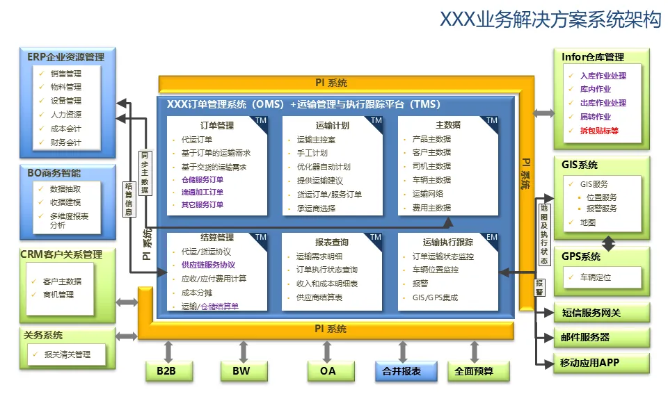 XXX 物流集团业务涵盖国内国际货代、运输配送、VMI 仓储、供应链金融等多元场景,面临着市场竞争激烈、客户需求多变、供应链脱节、IT 系统分散等多重挑战。现有系统缺乏统一标准,业财一体化程度低,导致数据割裂、流程冗余;货代运输的多模式协同、仓储库存的精准管控、复杂费用的结算核算等核心需求未能得到充分满足,亟需通过一体化系统打破业务壁垒。