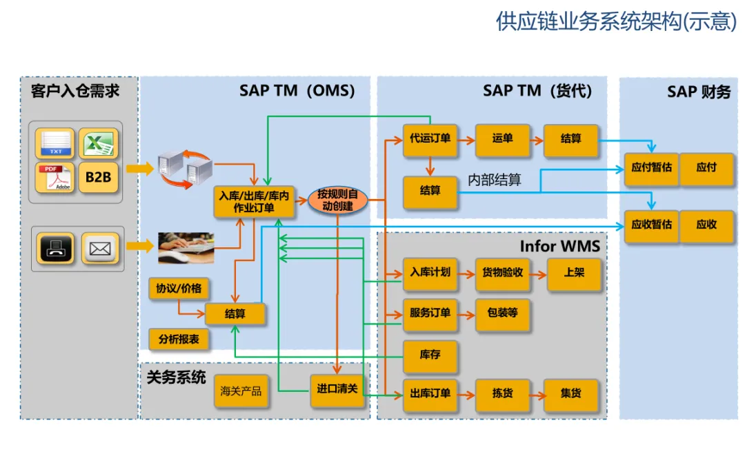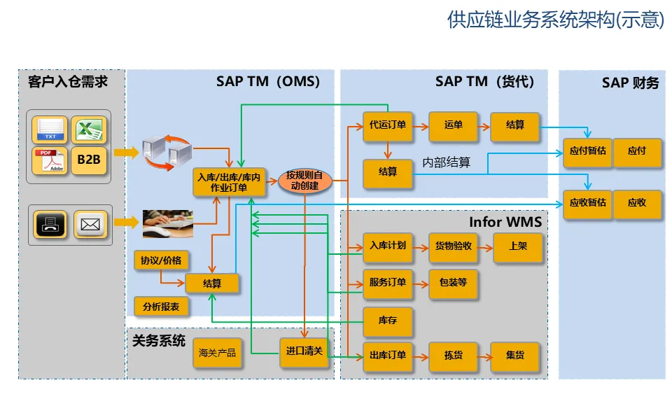 针对货代运输业务,通过 SAP TM 模块支持空运、海运、多式联运等多种模式,实现运输计划优化、路径规划与实时追踪;供应链业务以 EWM 仓储管理为核心,覆盖入库、出库、库内作业全流程,满足 VMI 库存预警、补货计划优化等需求。财务层面聚焦业财一体化,实现运输收入、成本费用的自动核算与分摊,通过银企直连、合并报表功能提升资金管控与报表输出效率;人力与集团管控模块则同步实现组织、人员、权限的规范化管理。