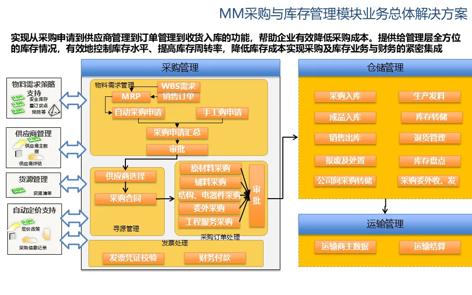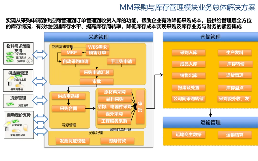 构建标准化、高效化的后勤支持体系,覆盖物资采购、设备管理、行政服务等核心场景。采购管理模块支持集中采购三种模式(物流中心配送式、统谈统签直送式、统谈分签直送式),通过货源管理与供应商评估优化采购成本,实现 “三单匹配”(采购订单、收货单、发票)的自动化校验。设备管理方面,在 SAP PM 模块维护车辆主数据与维修信息,同步至 TM 系统实现运输资源的统筹调度,通过定期维护保养提升资产利用率。行政服务集成线上审批流程,优化费用报销、办公用品管理等日常事务,降低管理成本。