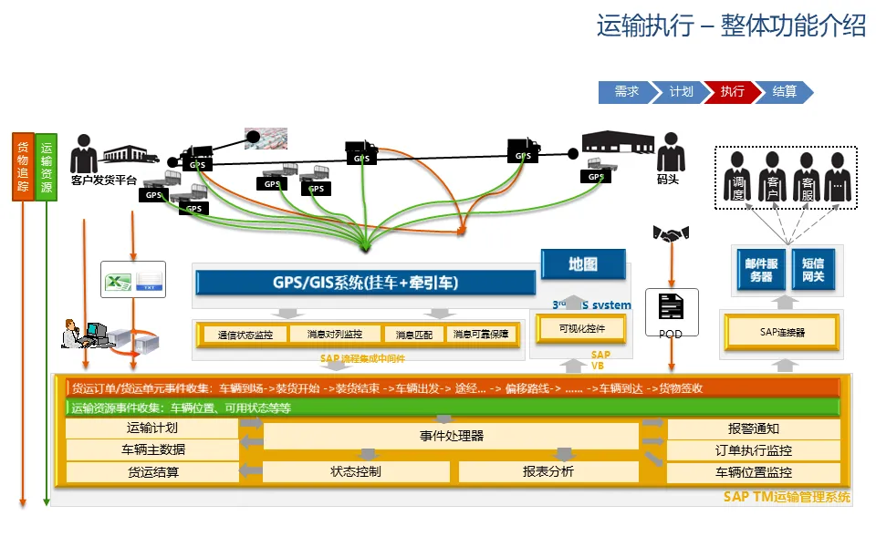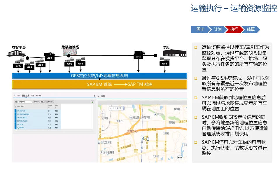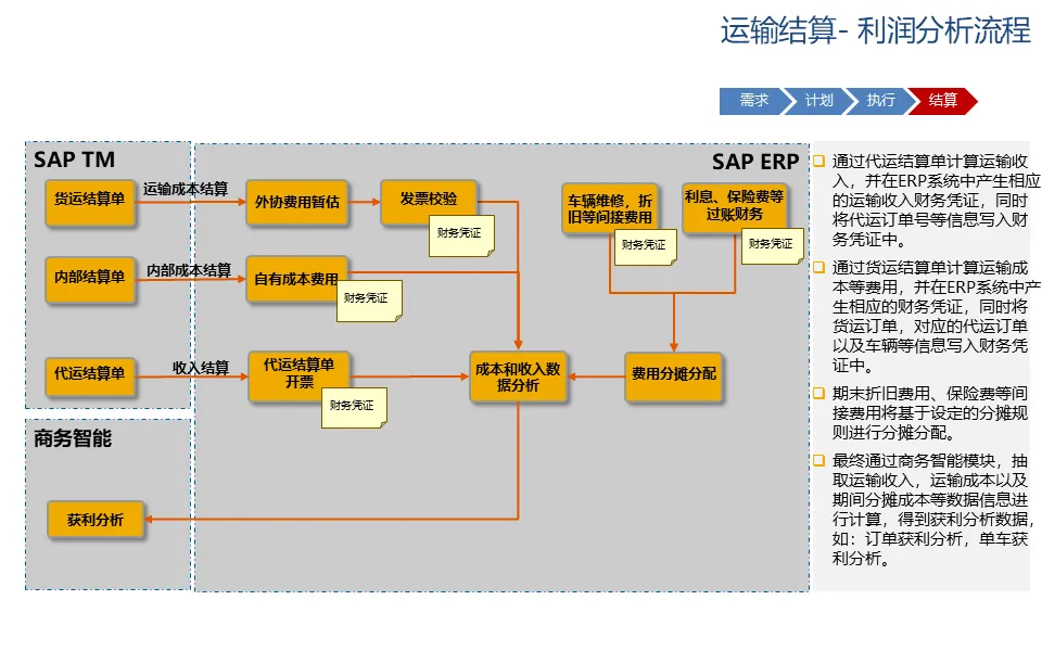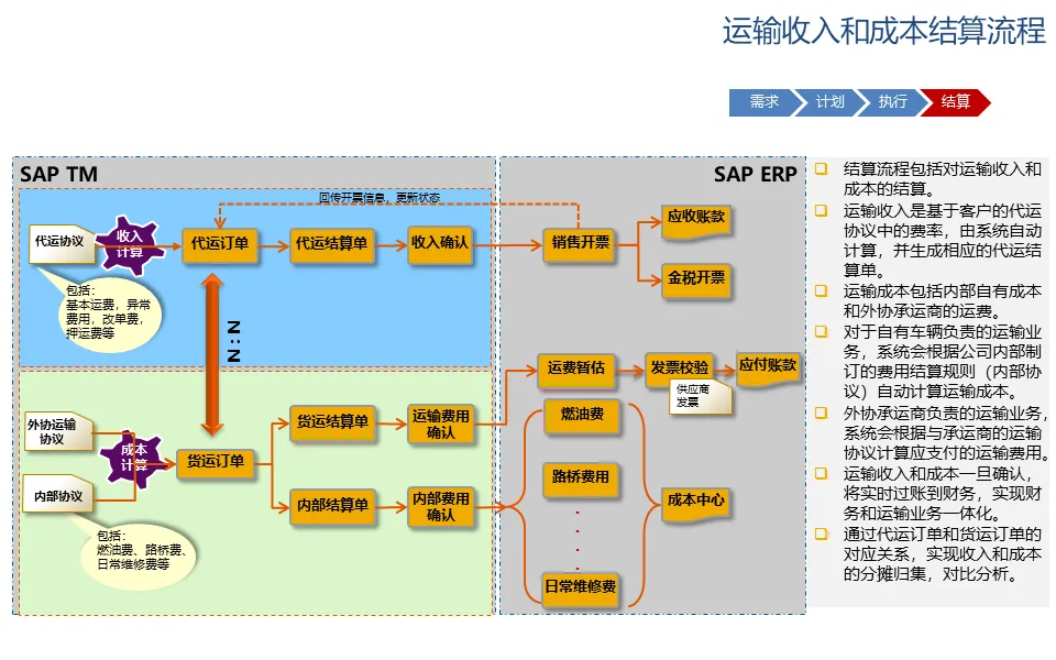 聚焦货代运输全流程,构建覆盖空运、海运、陆运及多式联运的一体化管理体系。通过 SAP TM 模块实现订单创建、订舱管理、路径优化与实时追踪的全流程线上化,集成 GIS/GPS 系统精准监控车辆位置与运输轨迹。针对 FCL(整箱)与 LCL(拼箱)业务场景,优化多点提货、集中运输与拼柜流程,通过自动运输优化器实现线路规划与运力匹配的智能化。结算环节与财务系统无缝对接,基于运输协议自动计算收入与成本,支持内部自有车辆与外协承运商的费用分摊,显著提升结算效率与准确性。