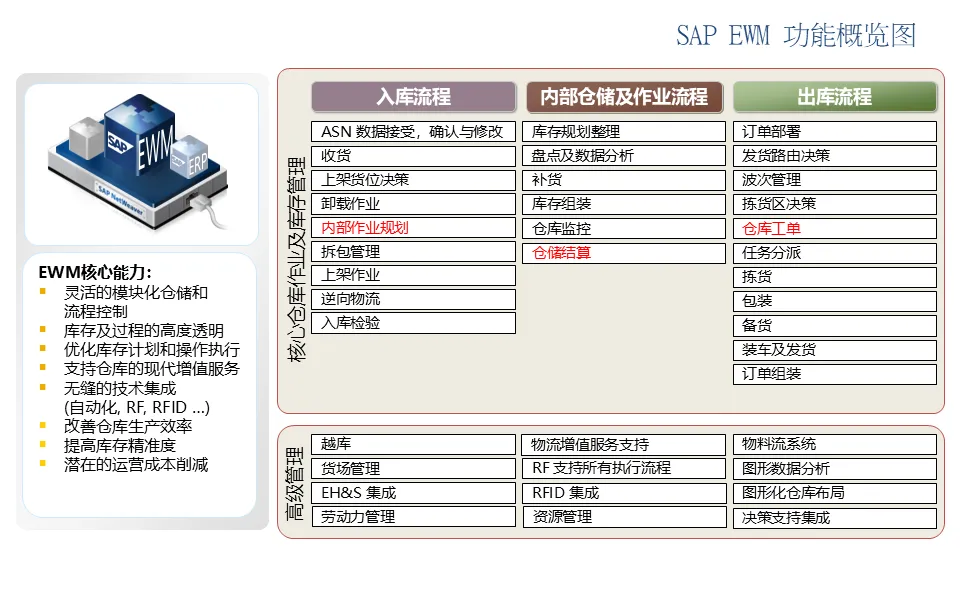 以 VMI 仓储管理为核心,打造 “需求预测 - 库存管控 - 配送执行” 的闭环供应链体系。通过 EWM 模块覆盖入库、上架、拣货、出库全流程作业,支持库存预警、补货计划优化与增值服务(如拆包、贴标)。建立多渠道信息共享机制,实现客户、供应商与仓库管理方的实时数据交互,有效抑制供应链牛鞭效应。整合关务系统与运输模块,打通 “报关 - 仓储 - 运输” 协同链路,针对汽车、IT 等重点行业提供定制化解决方案,满足少量多样齐套配送与多点配送需求,提升供应链快速响应能力。