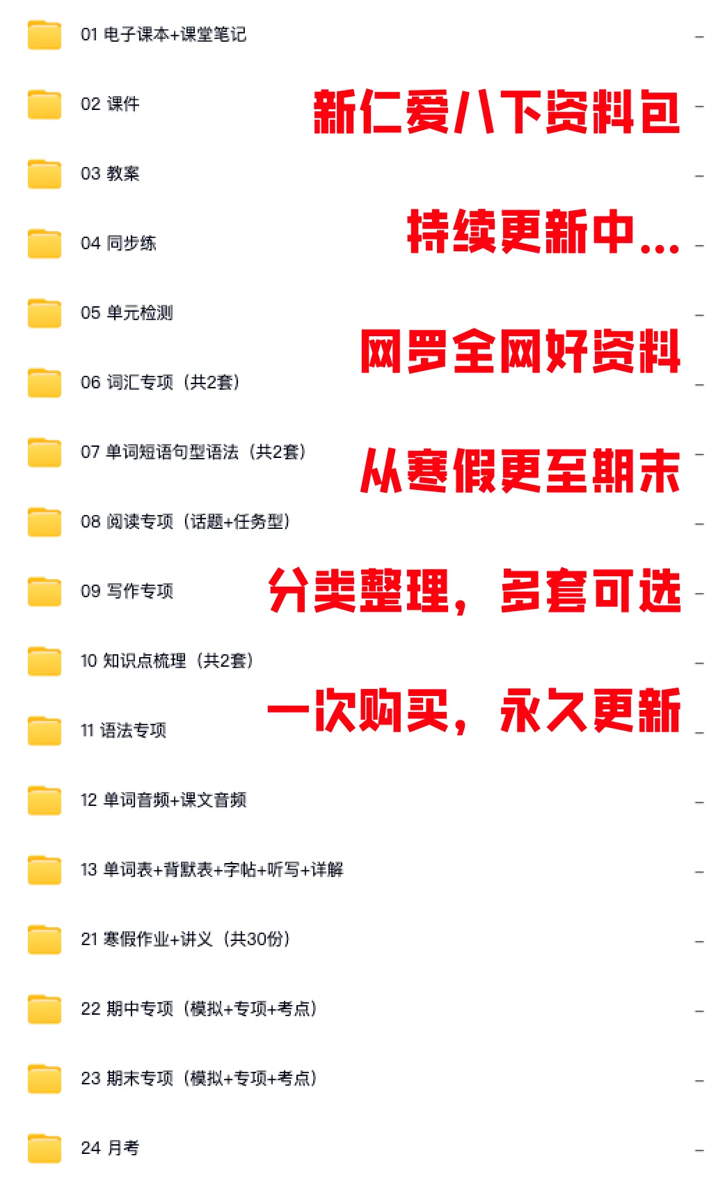 2026春新仁爱八下英语课件PPT+单词PPT+开学第一课PPT+教学设计+课堂笔记+课文单词MP3+默写表+课时练+单元检测+知识点+语法阅读+期中期末卷,欢迎转发打印学习,文末还可获取仁爱八下英语资料包(含同步课件+教案+教学计划+同步练习+单元检测卷+单词背默表+字帖表+知识点清单+语法精炼+课堂笔记+话题任务型阅读写作+期中期末卷+寒假讲义等)