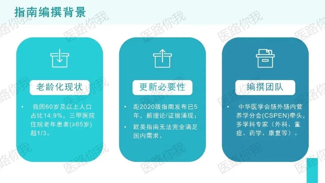 人口老龄化浪潮下,老年患者的医学营养治疗已成为改善临床结局的关键一环。近日,由中华医学会肠外肠内营养学分会(CSPEN)牵头,多学科专家联合编撰的《中国老年患者医学营养治疗指南(2026版)》正式发布!新指南立足国内临床痛点,整合2000-2024年最新循证证据,提炼出29个关键临床问题与53条推荐意见。从筛查到安宁疗护,从通用原则到特殊疾病,为老年营养管理提供了权威的“中国方案”。本文将从四大维度为您深度拆解核心要点。
