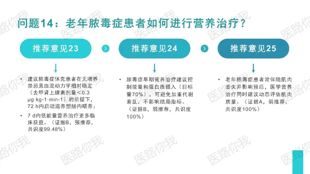 脓毒症:血流动力学稳定后72h内启动滋养型EN;早期能量控制在目标量70%;动态评估肌肉质量。