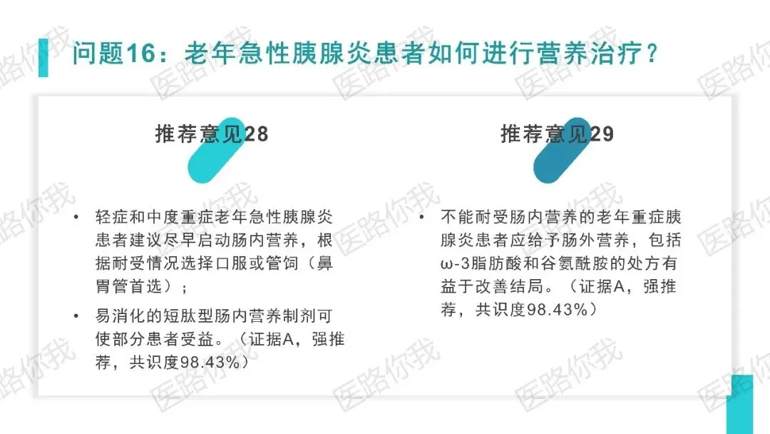 急性胰腺炎:轻/中重症尽早EN(鼻胃管首选);重症不耐受选PN,添加ω-3和谷氨酰胺。