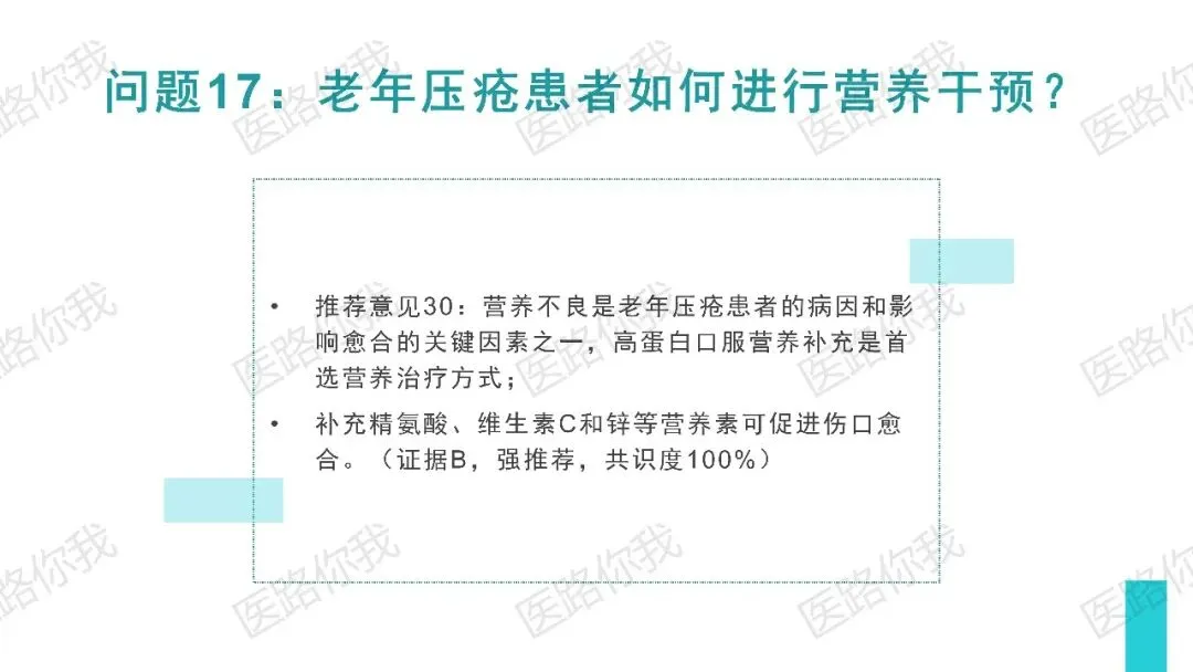 压疮:首选高蛋白ONS;额外补充精氨酸、Vit C、锌促愈合。