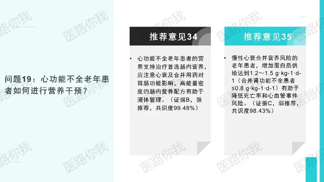 心功能不全:首选EN,高能量密度配方利限液;心衰合并营养风险者蛋白提至1.2-1.5 g/kg(肾不全者≤0.8)。