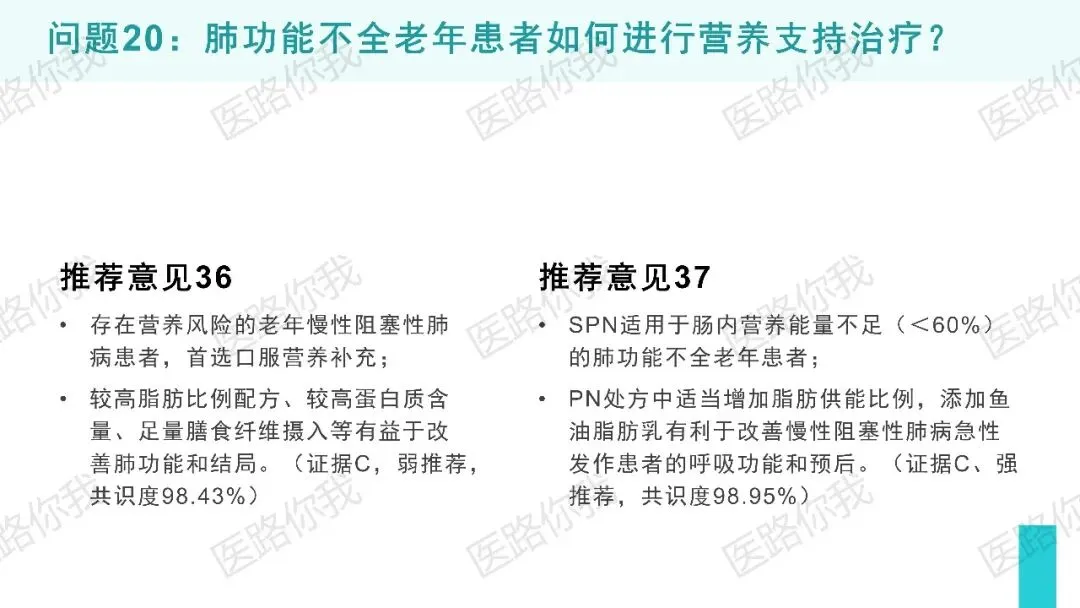 肺功能不全 (COPD):首选ONS;配方高脂、高蛋白、高纤维(降低呼吸商);PN中加鱼油改善预后。