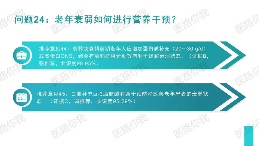 衰弱:蛋白20-30g/d+ 抗阻运动;补充ω-3有益。