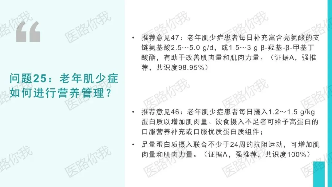 肌少症:蛋白1.2-1.5 g/kg+≥24周抗阻运动;补充亮氨酸或HMB是关键。