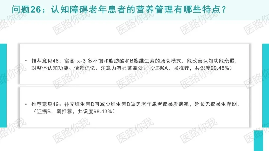 认知障碍:富含ω-3 + B族维生素膳食模式;Vit D缺乏者补充可降痴呆风险。