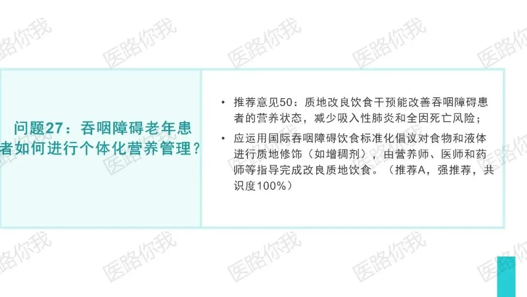 吞咽障碍:严格执行IDDSI标准进行质地改良(增稠),降低吸入性肺炎风险。